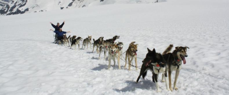 И пока внизу расцветает скромное аляскинское лето, поверхность горных ледников по-прежнему покрыта снегом. И это идеальные условия для катания на собачьих упряжках. Подняться сюда удобнее всего на вертолете, совершив по дороге тур над горами и лесами национальных парков, разглядывая с высоты птичьего полета суровую природу Аляски. А на верху нас уже будут ждать знаменитые аляскинские маламуты - сильные и выносливые собаки, выведенные именно здесь, на Аляске, в качестве ездовой служебной породы.