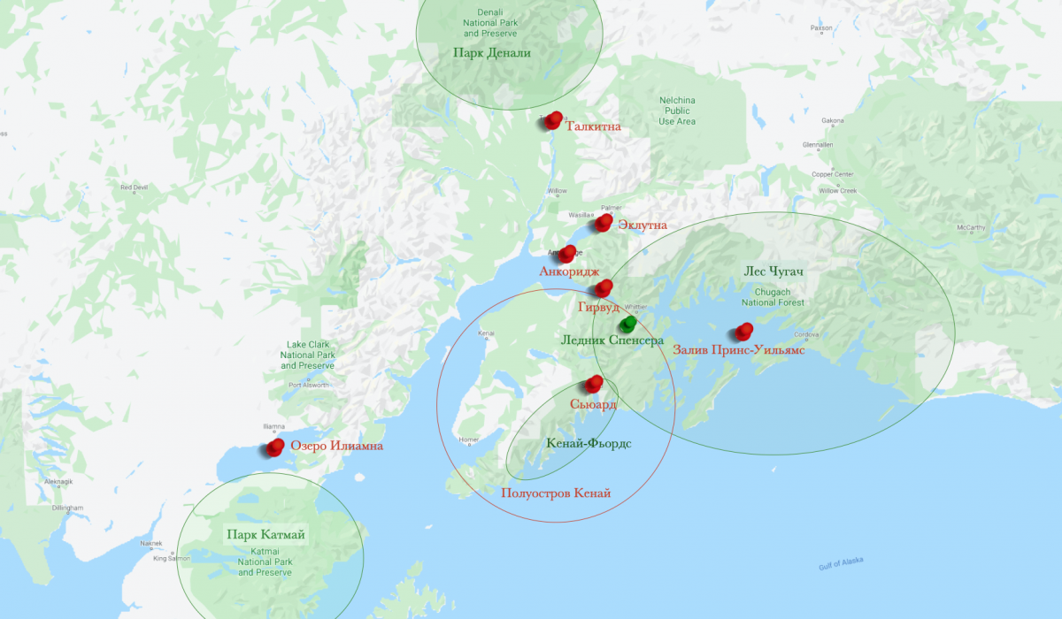 Национальные парки, города и некоторые достопримечательности в районе Анкориджа. Для увеличения изображения нажмите на него.