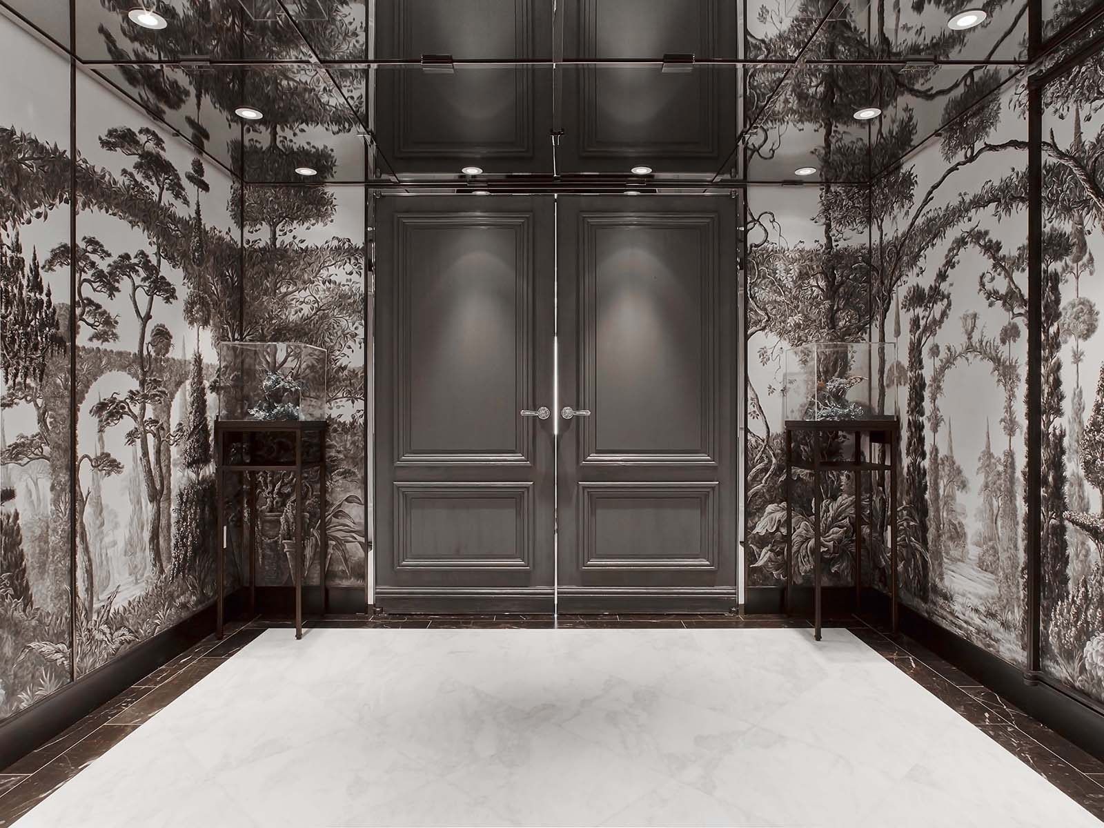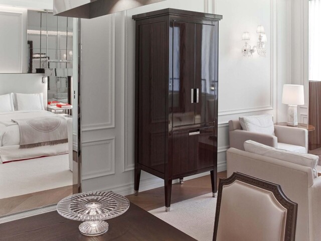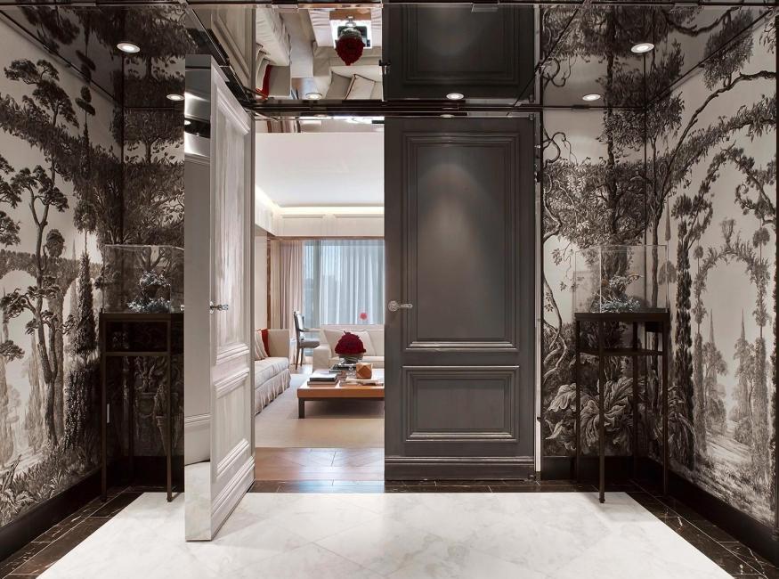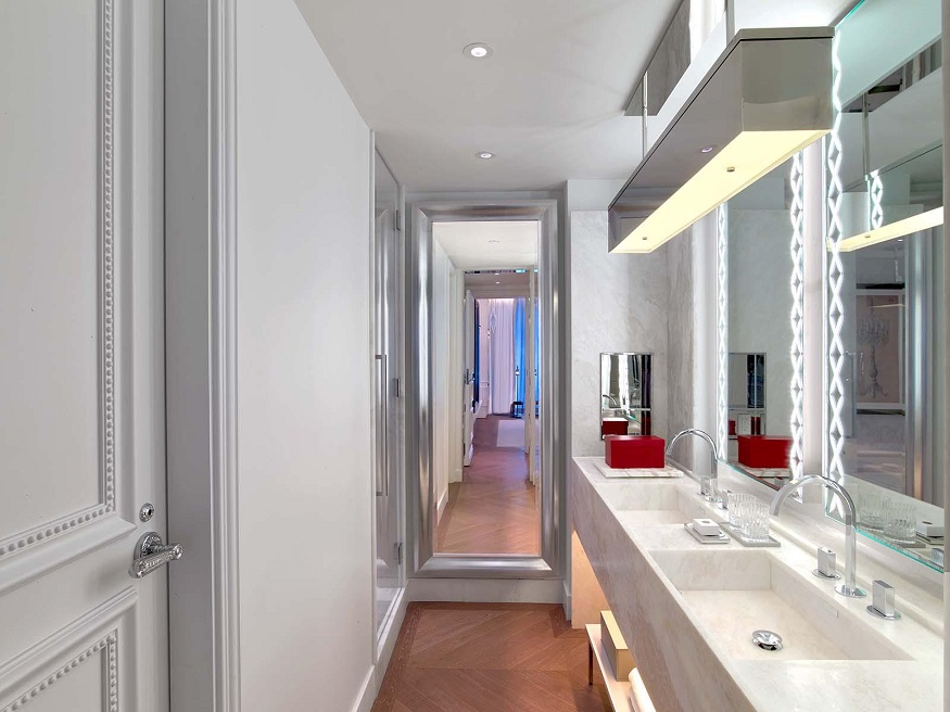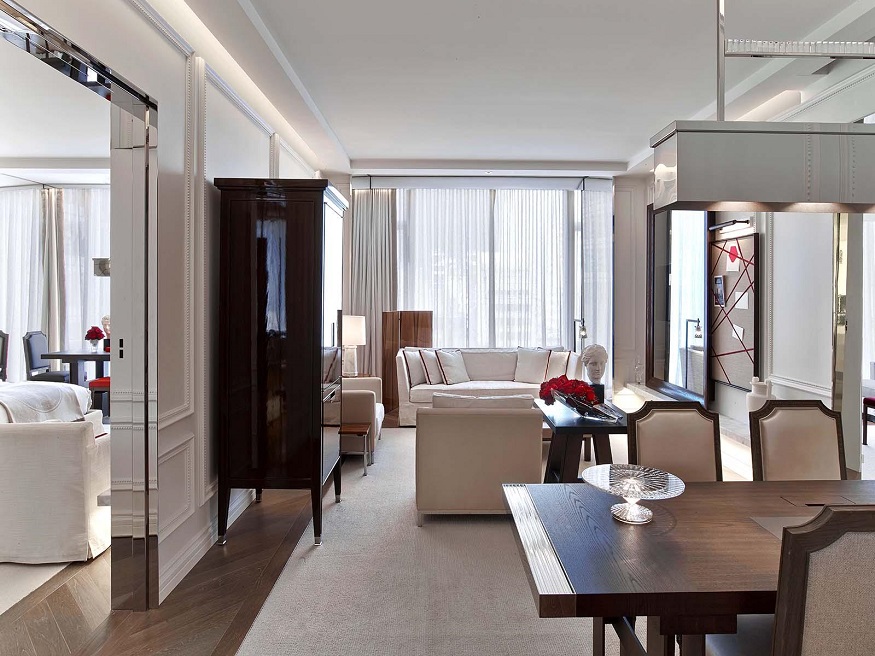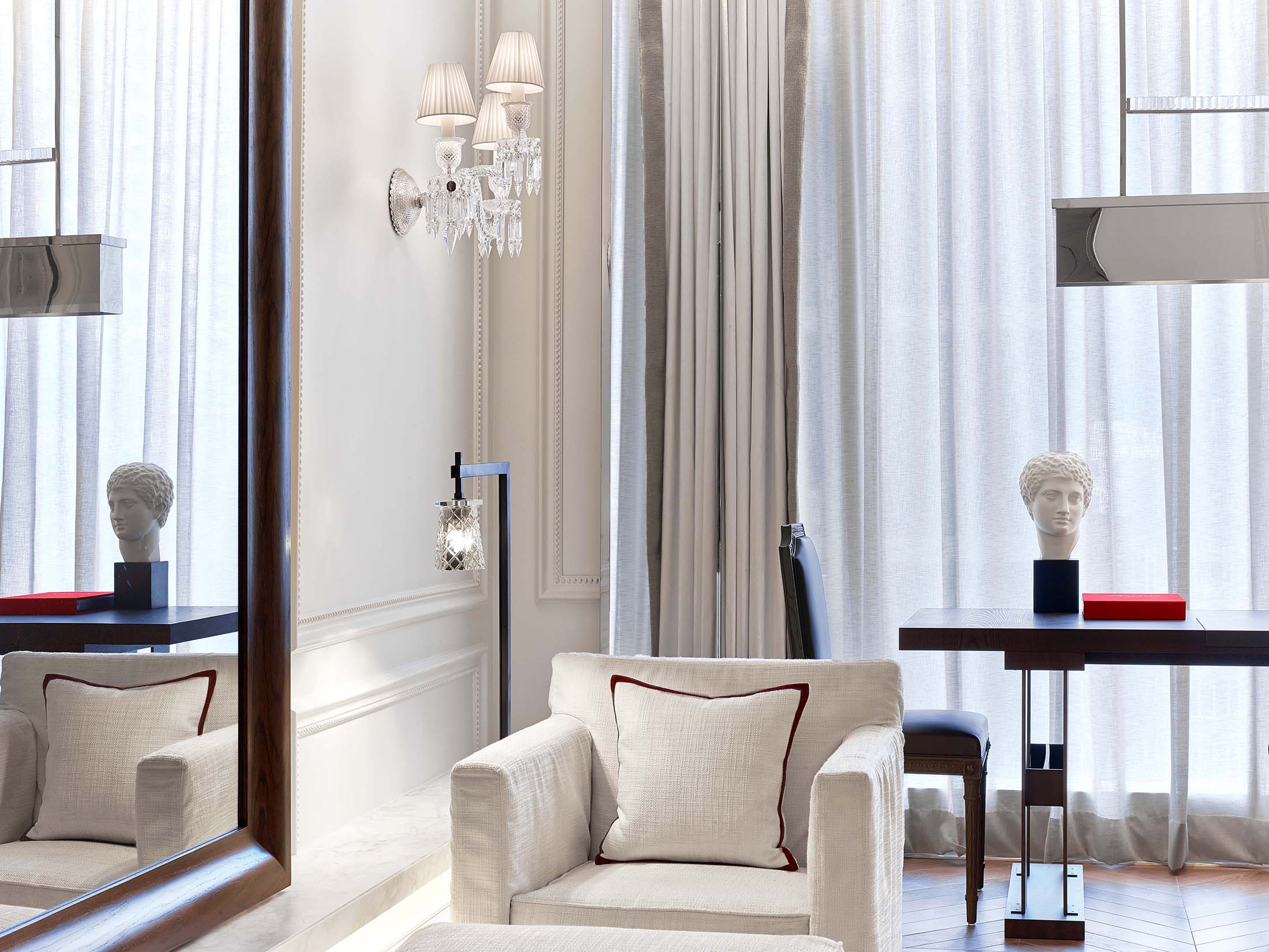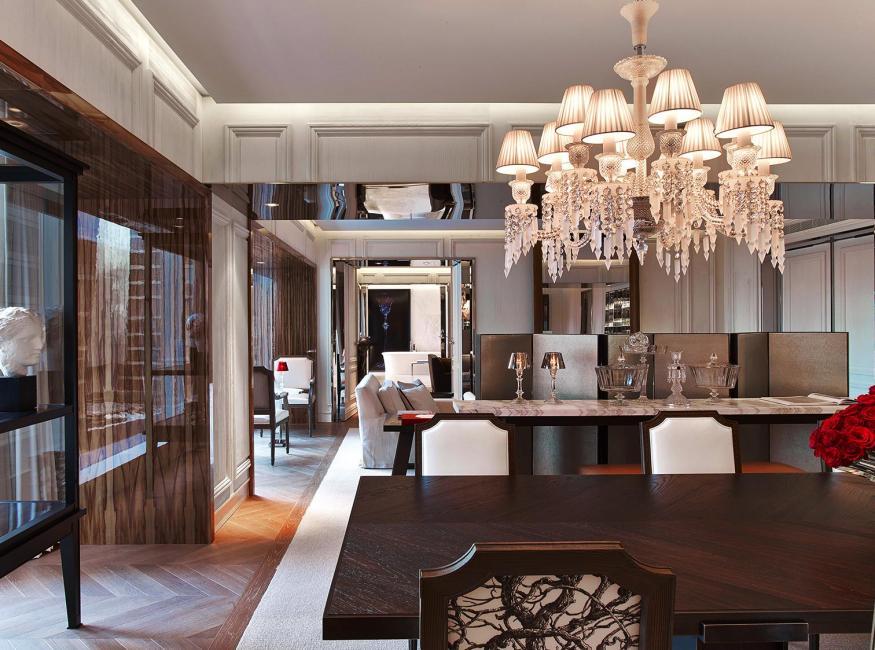 Просторные интерьеры сочетают классическую роскошь и современный подход к видению жилых пространств. Шелковые ткани, гобелены и ковры ручной работы, тщательно подобранные образцы натурального камня, серебряный декор, предметы искусства – каждый предмет мебели и каждая деталь были продуманы и созданы архитекторами Gilles & Boissier специально для этого отеля. И, конечно же они наполнили пространства сияющим блеском хрусталя Баккара.