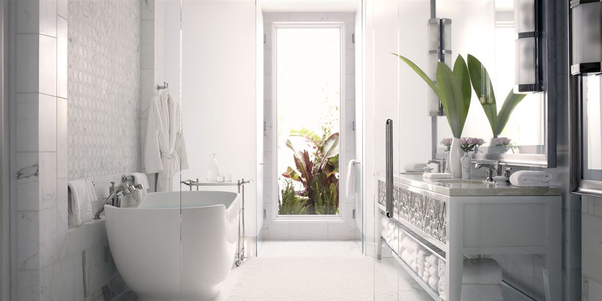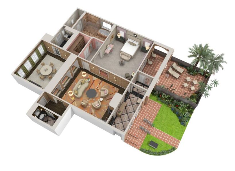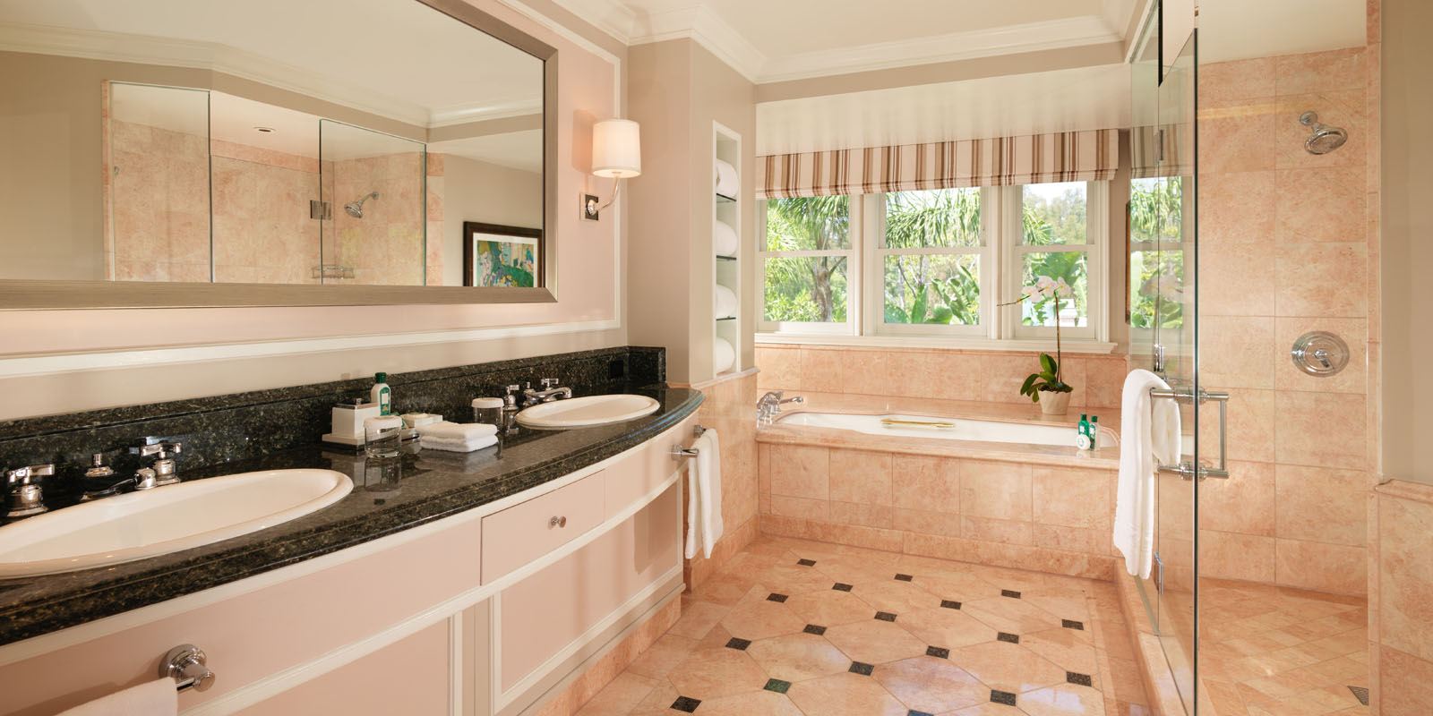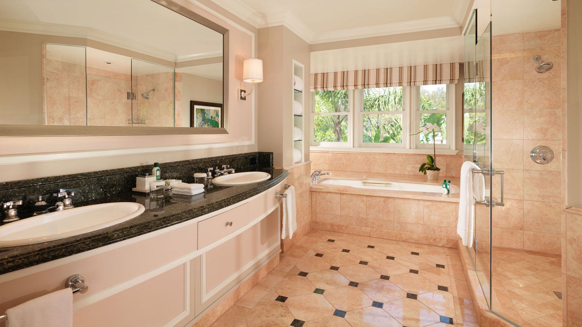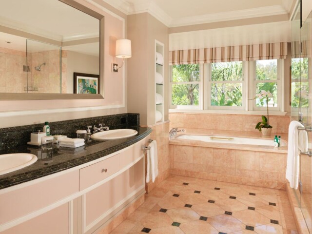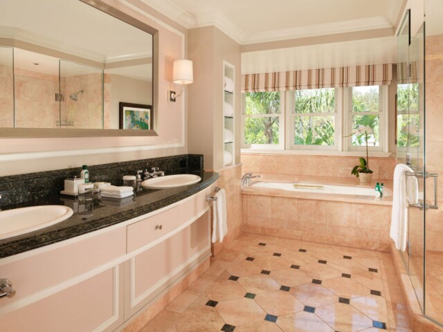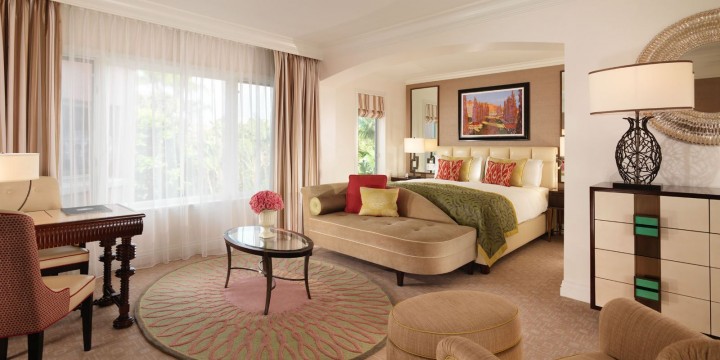 Номер декорирован в теплых тонах с розовыми, зелеными и золотыми оттенками. В номере спальня, просторная гостиная, столовая. Отделанная мрамором ванная комната с двойной раковиной, ванной и отдельной душевой кабиной. Гостевой туалет. Патио. Возможно присоединение 2 дополнительных спален.