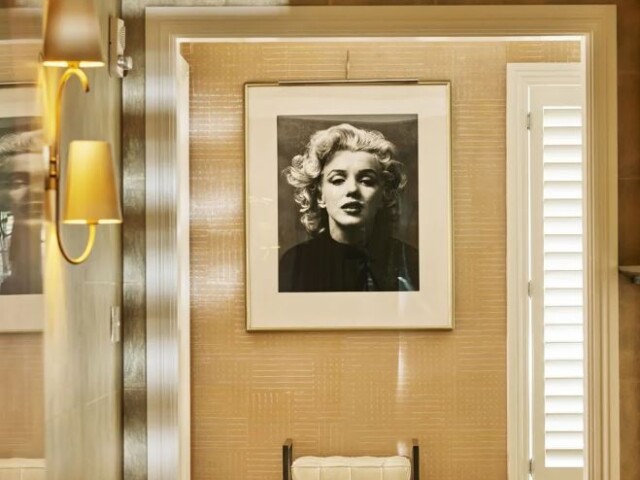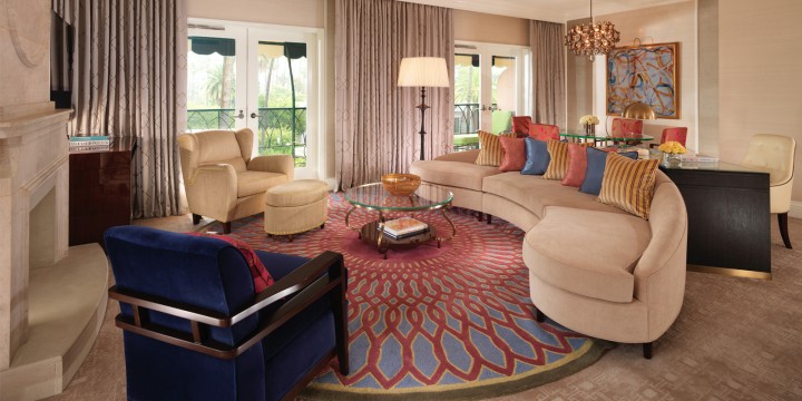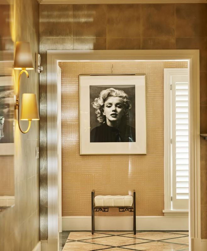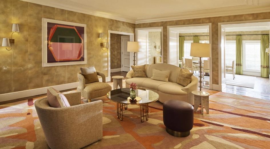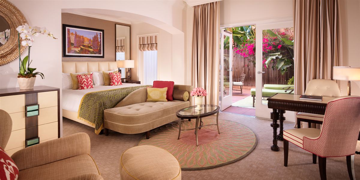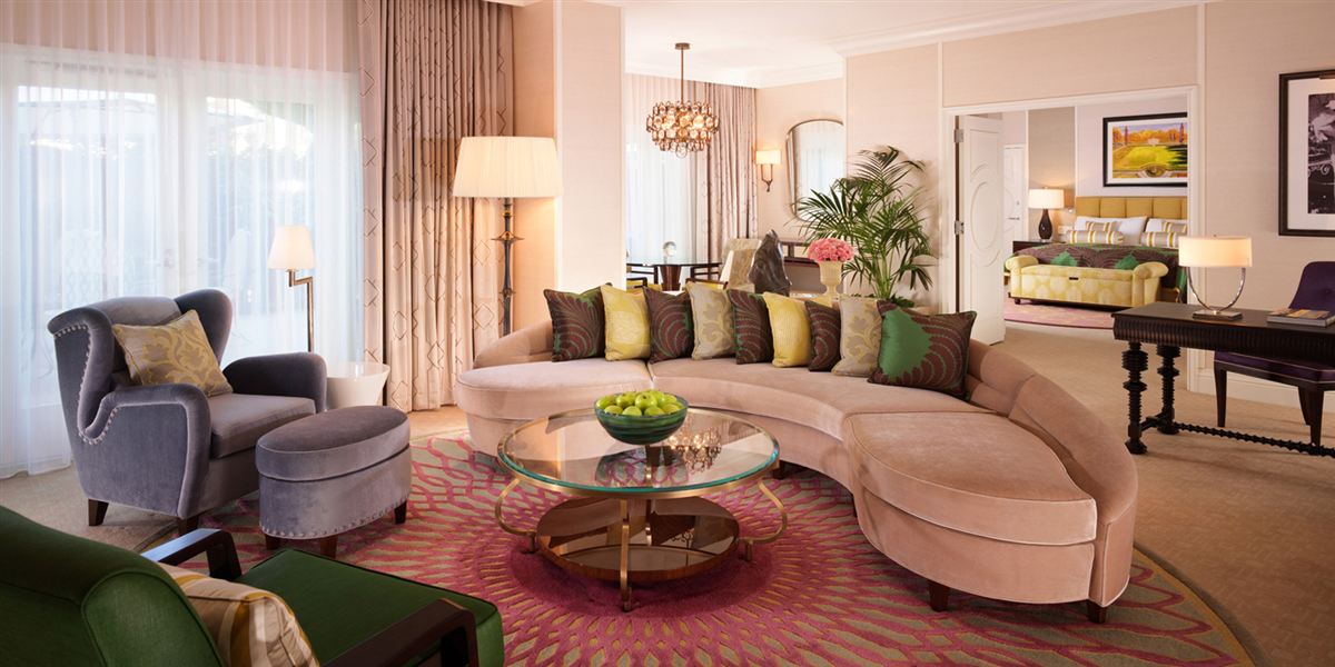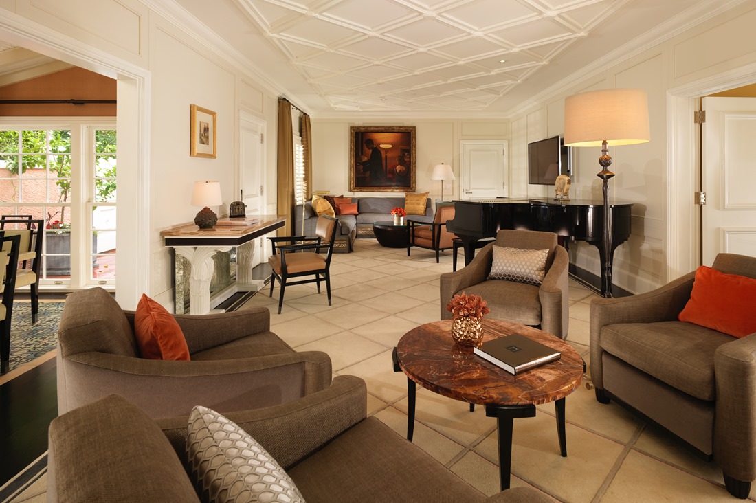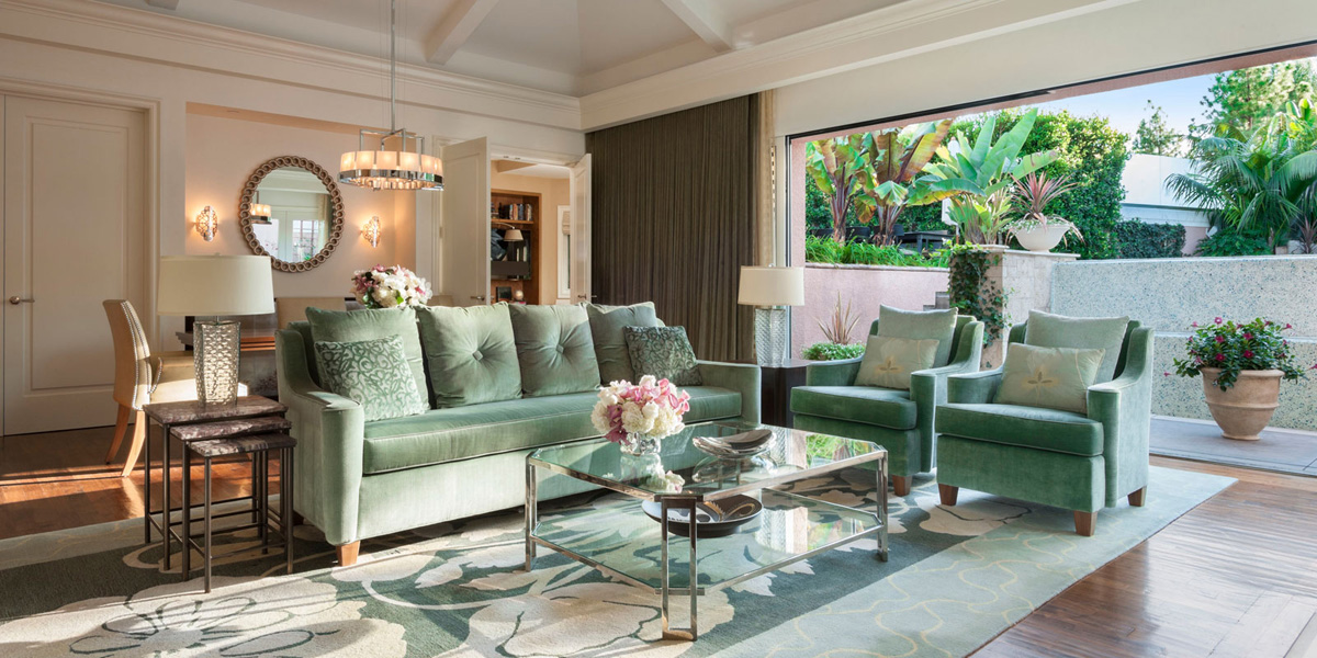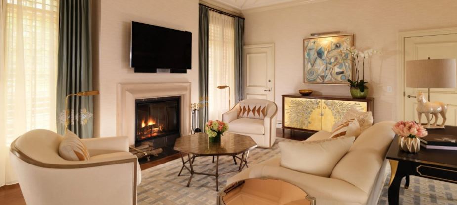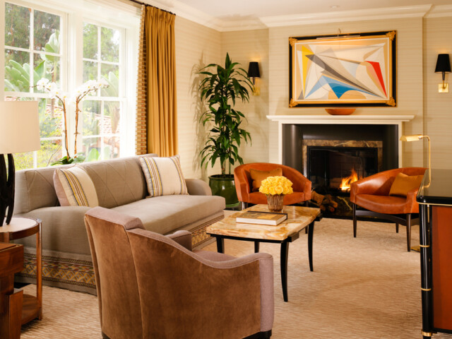 Интерьер создан в стиле Palm Springs, сделанная на заказ мебель, богатые ткани, восьмиугольный потолок в гостиной комнате. В номере большая гостиная с камином и роялем, обеденная зона со столом, спальня с камином. Меблированное патио с уличным камином. Отделанная мрамором ванная комната с ванной и отдельной душевой кабиной. Гостевой туалет.
