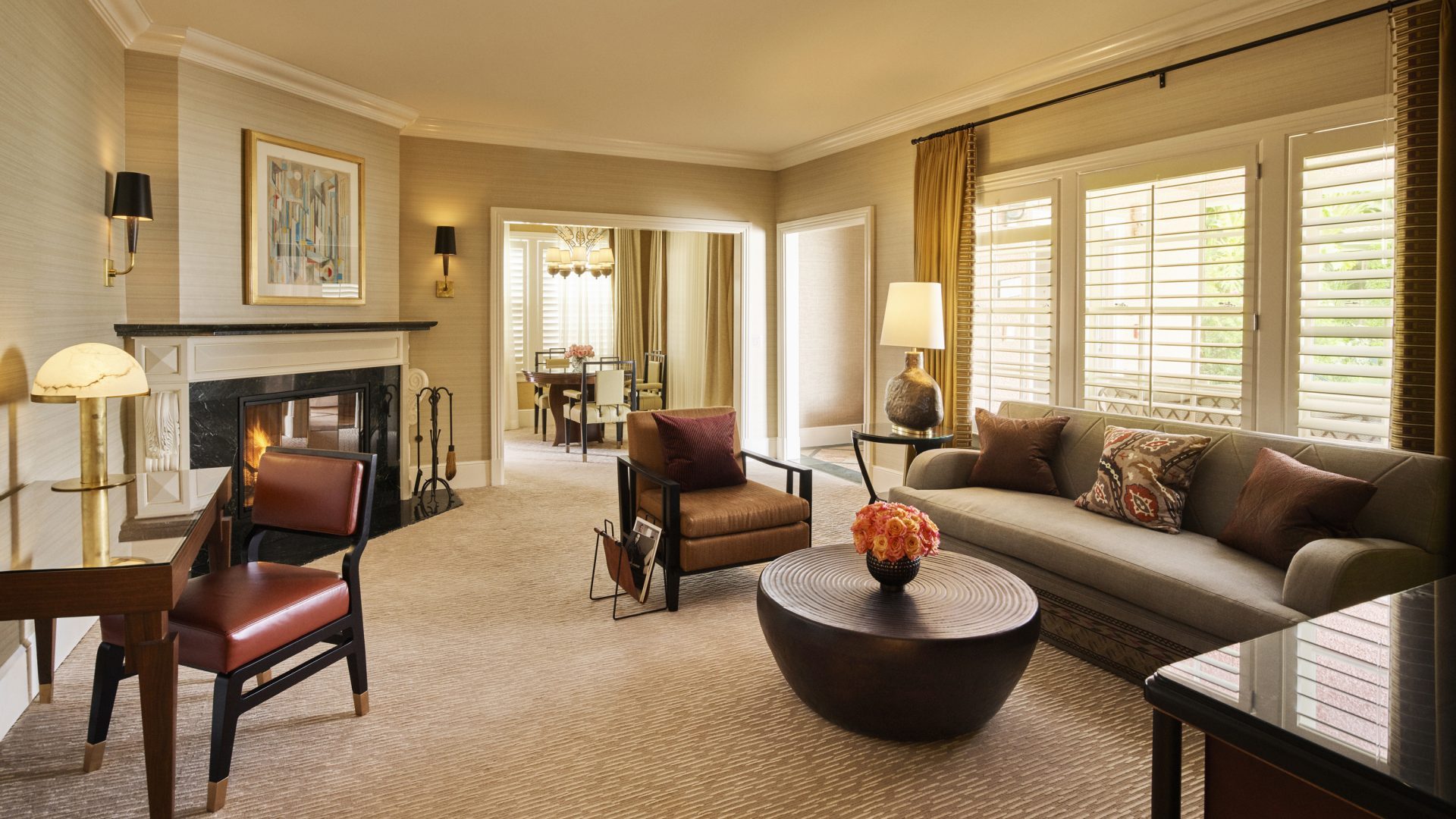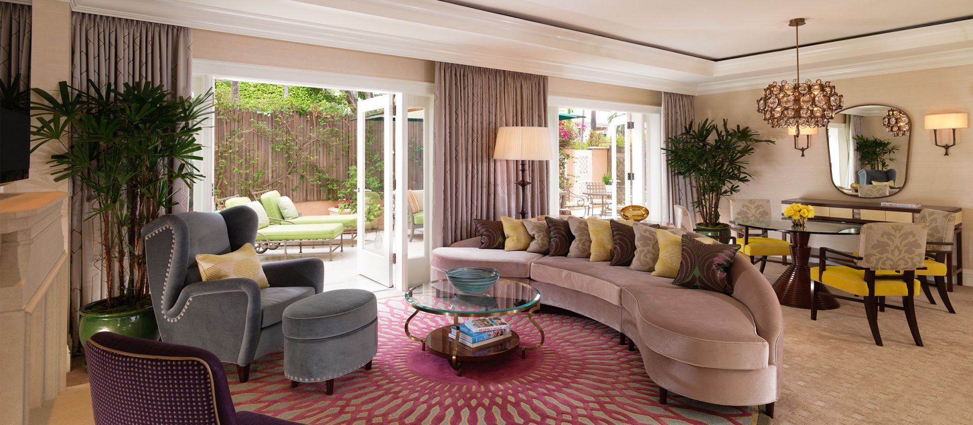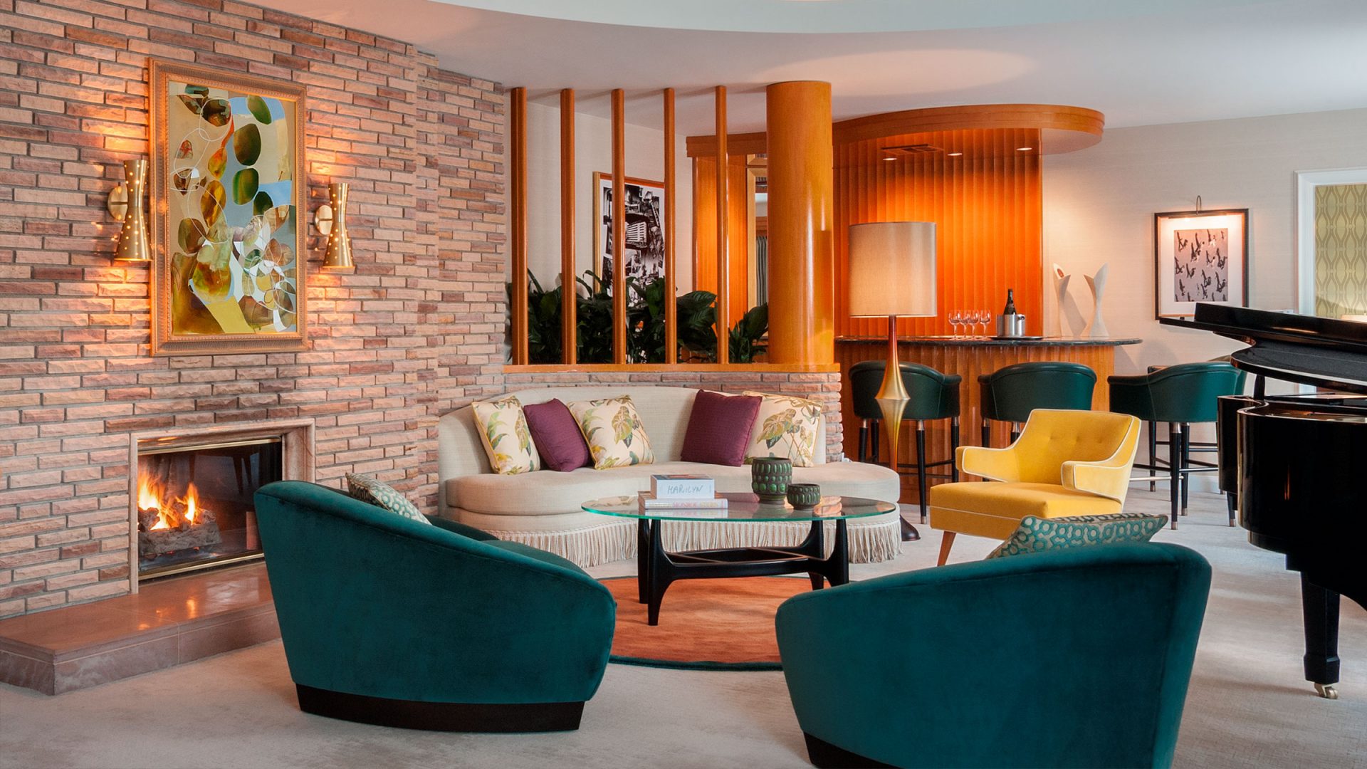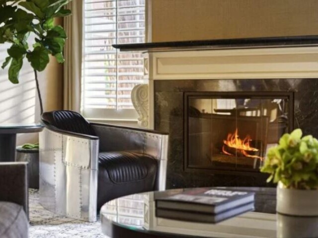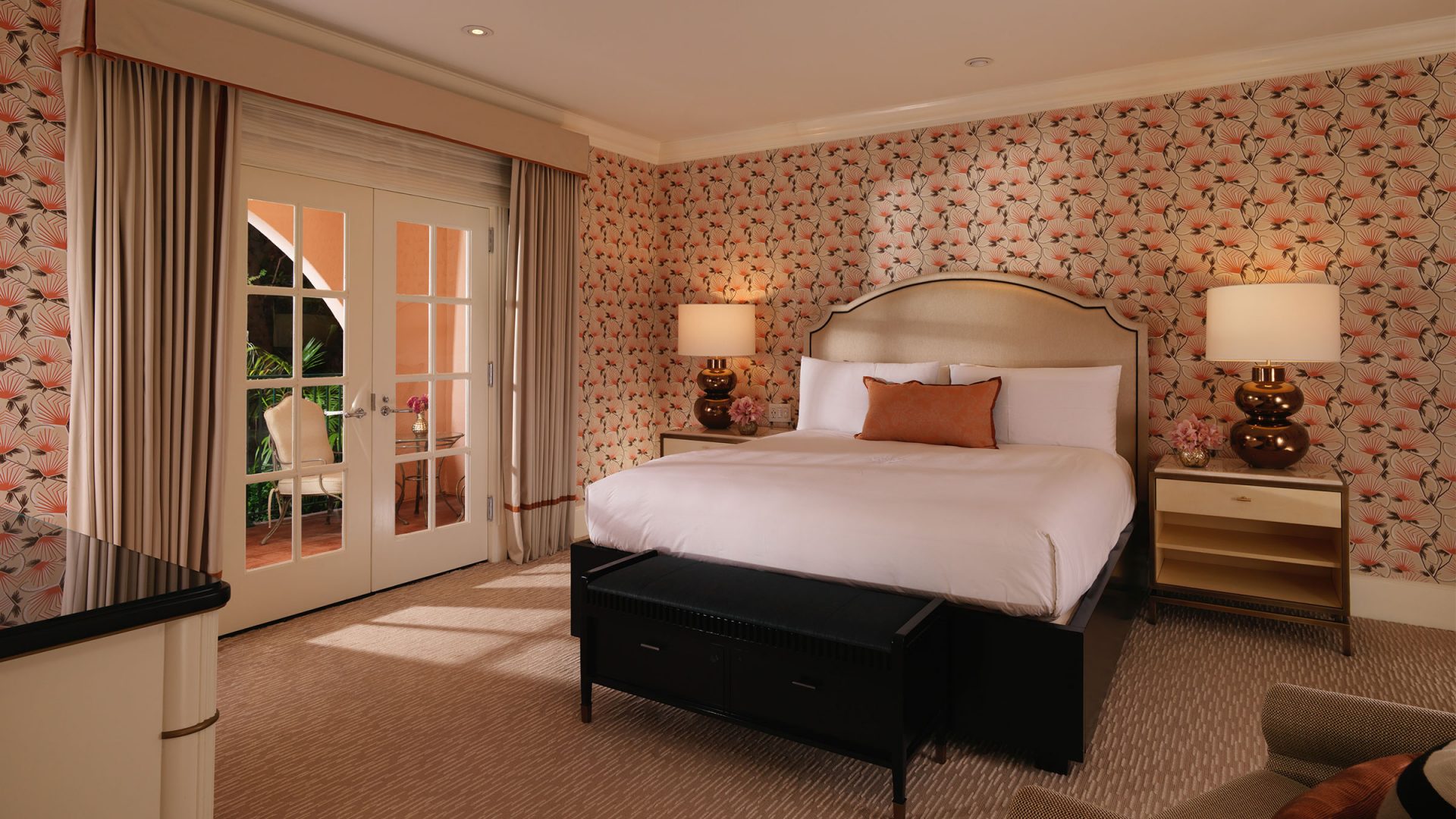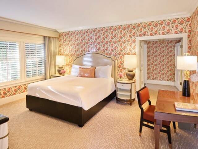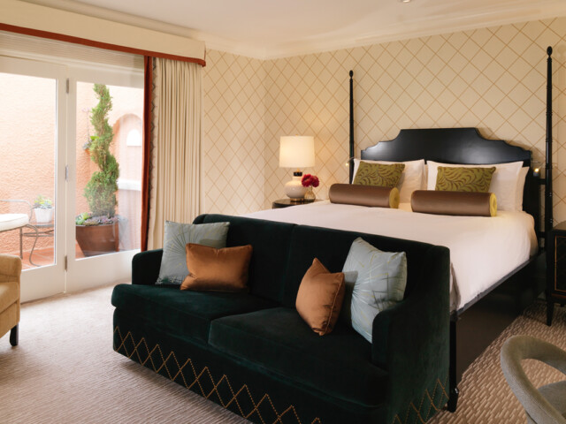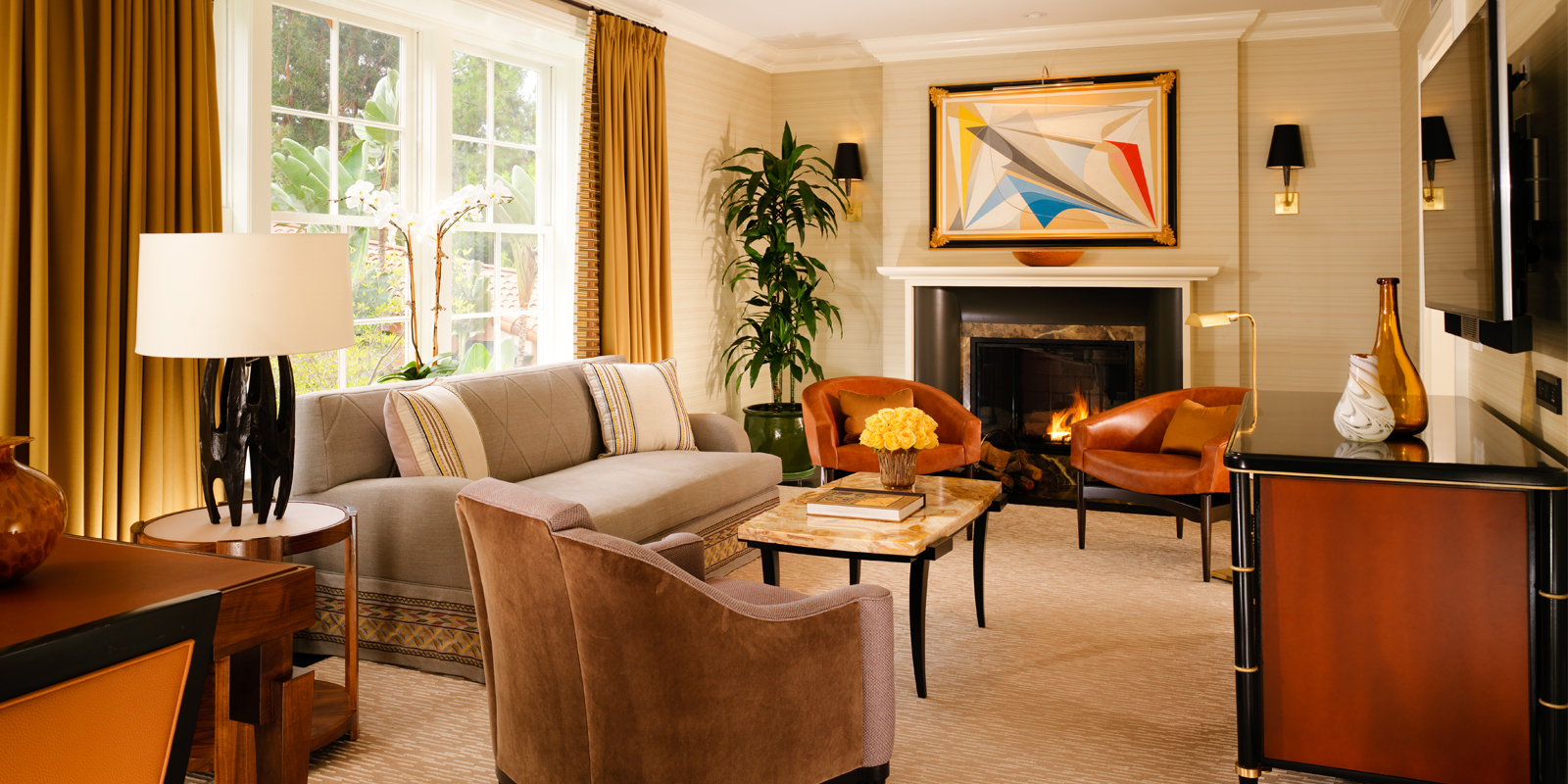 Интерьер создан в стиле Palm Springs, сделанная на заказ мебель, богатые ткани, восьмиугольный потолок в гостиной комнате. В номере большая гостиная с камином и роялем, обеденная зона со столом, спальня с камином. Меблированное патио с уличным камином. Отделанная мрамором ванная комната с ванной и отдельной душевой кабиной. Гостевой туалет.