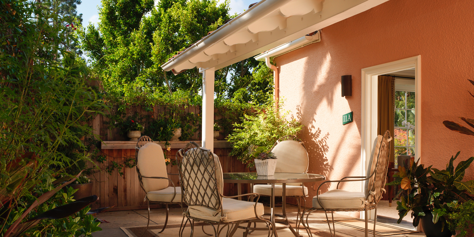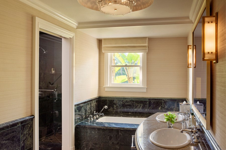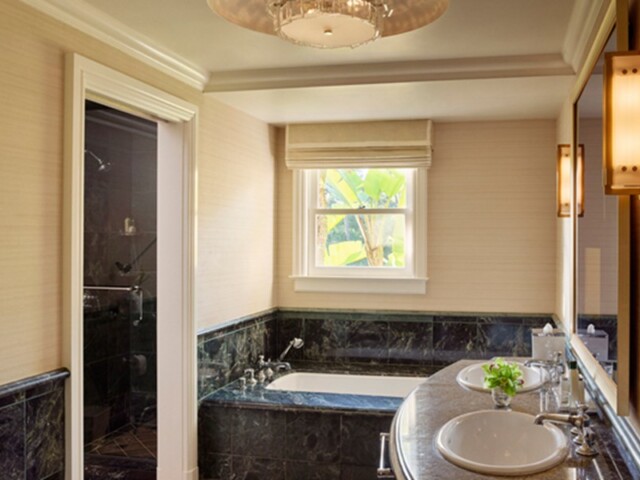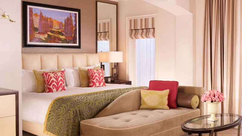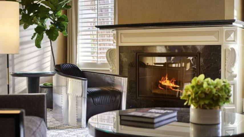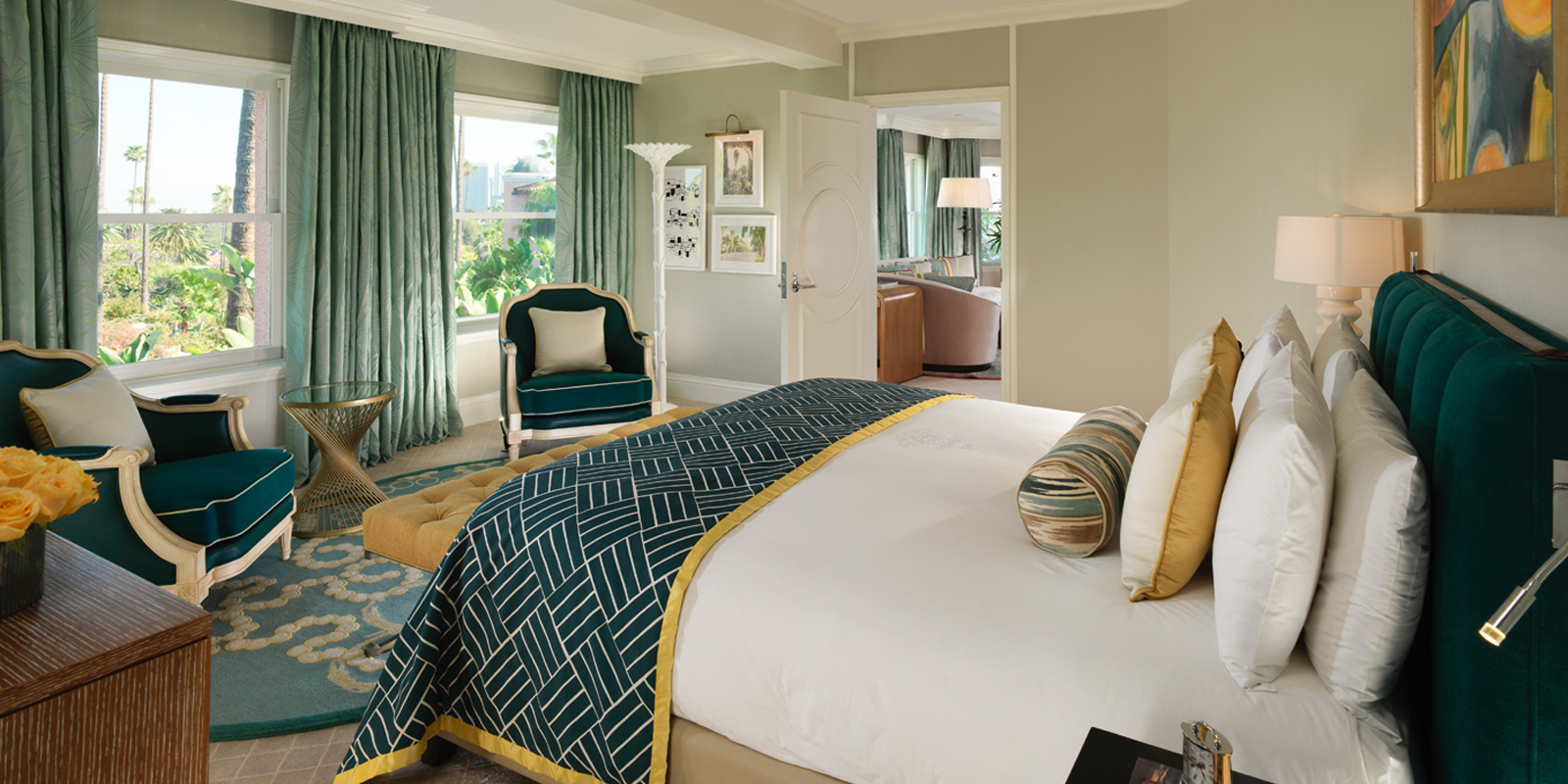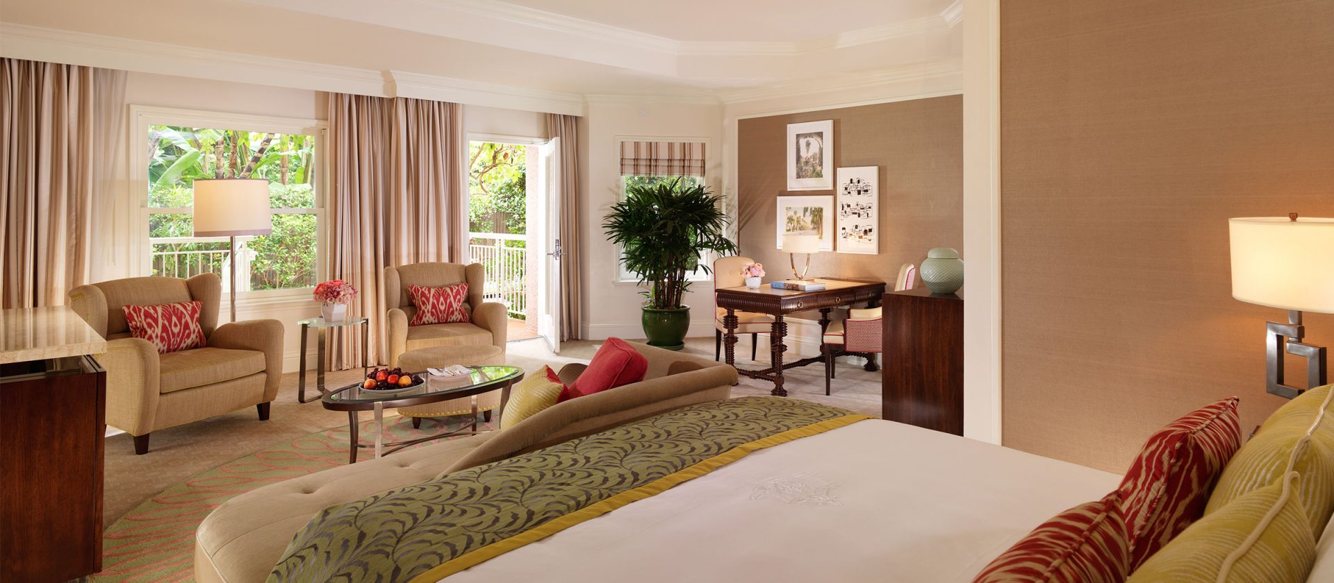 Интерьер создан в стиле Palm Springs, сделанная на заказ мебель, богатые ткани, восьмиугольный потолок в гостиной комнате. В номере большая гостиная с камином и роялем, обеденная зона со столом, спальня с камином. Меблированное патио с уличным камином. Отделанная мрамором ванная комната с ванной и отдельной душевой кабиной. Гостевой туалет.