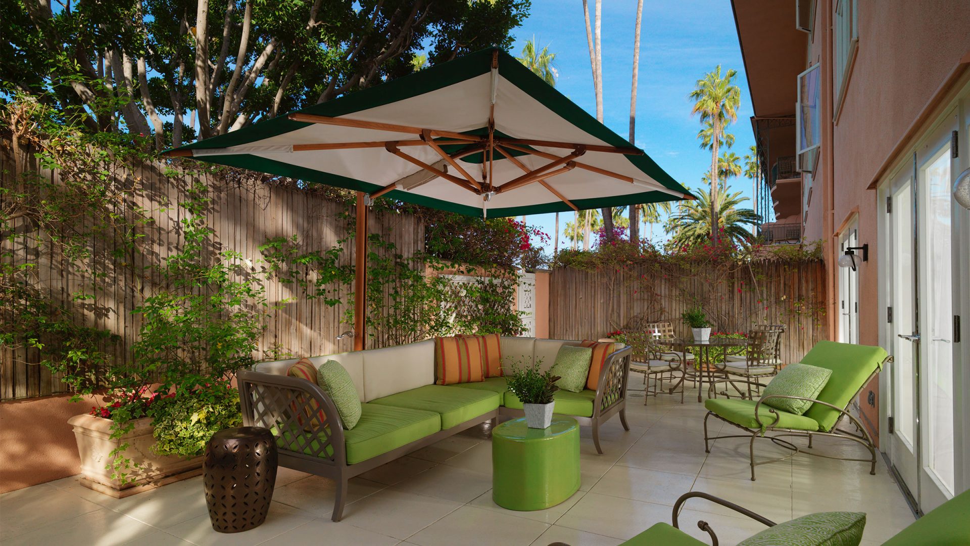 11 индивидуальных павильонов – cabanas, названных в честь самых знаменитых районов Лос-Анджелеса, включая Голливуд. В каждом павильоне есть ТВ-панель, Apple TV, зарядная станция, сейф, мини-бар, плюшевые халаты, солнцезащитные средства и бутилированная вода.