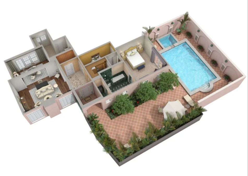 В номере: спальня с небольшой зоной отдыха и выходом на террасу с бассейном и зоной для проведения спа процедур. Гостиная с мягкой мебелью и камином. Столовая с обеденным столом на 6 персон, полностью оборудованная кухня. Отделанная мрамором ванная комната с ванной и отдельной душевой кабиной. Гостевой туалет.