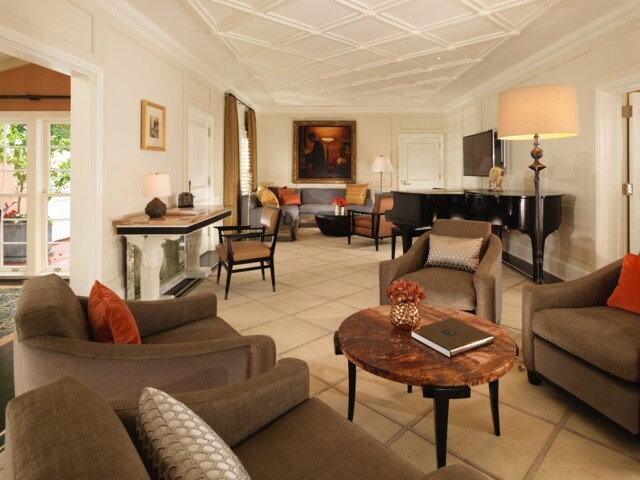 Роскошный просторный номер, дизайн которого был разработан Rottet Studio. Каждый номер Presidential Bungalow – это современная интерпретация традиционного исторического дизайна в средиземноморском стиле. В номере: спальня с камином и выходом на меблированную террасу. Просторная гостиная с мягкой мебелью, камином и большими панорамными окнами от пола до потолка. Рабочий кабинет с видом на сад и на бассейн. Обеденная зона со столом на 10 персон, полностью оборудованная кухня с отдельным входом для прислуги.