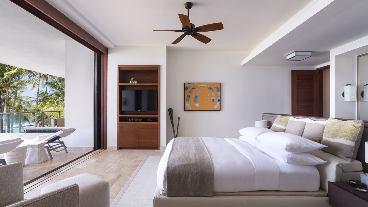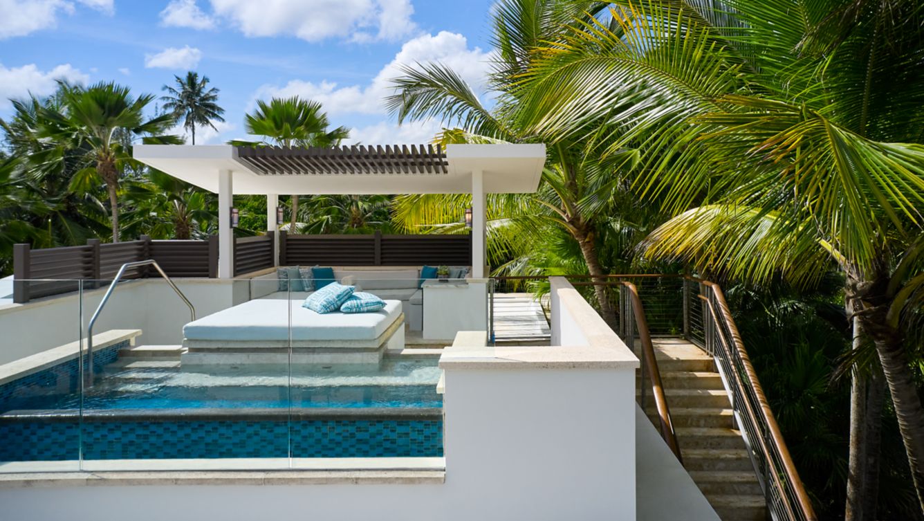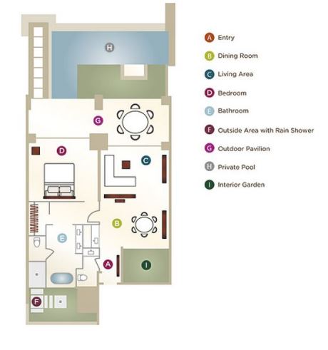 Зона отдыха с диваном, просторная гардеробная комната. Ванная комната с двойной раковиной, ванной, отдельными душевыми кабинами с тропическим душем (один в ванной, другой на улице). Меблированная терраса с обеденным столом и шезлонгом и персональным бассейном.