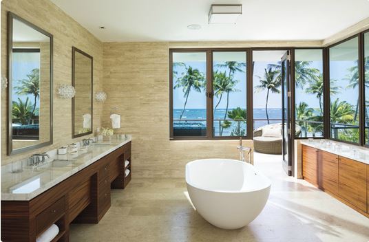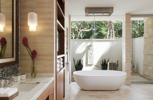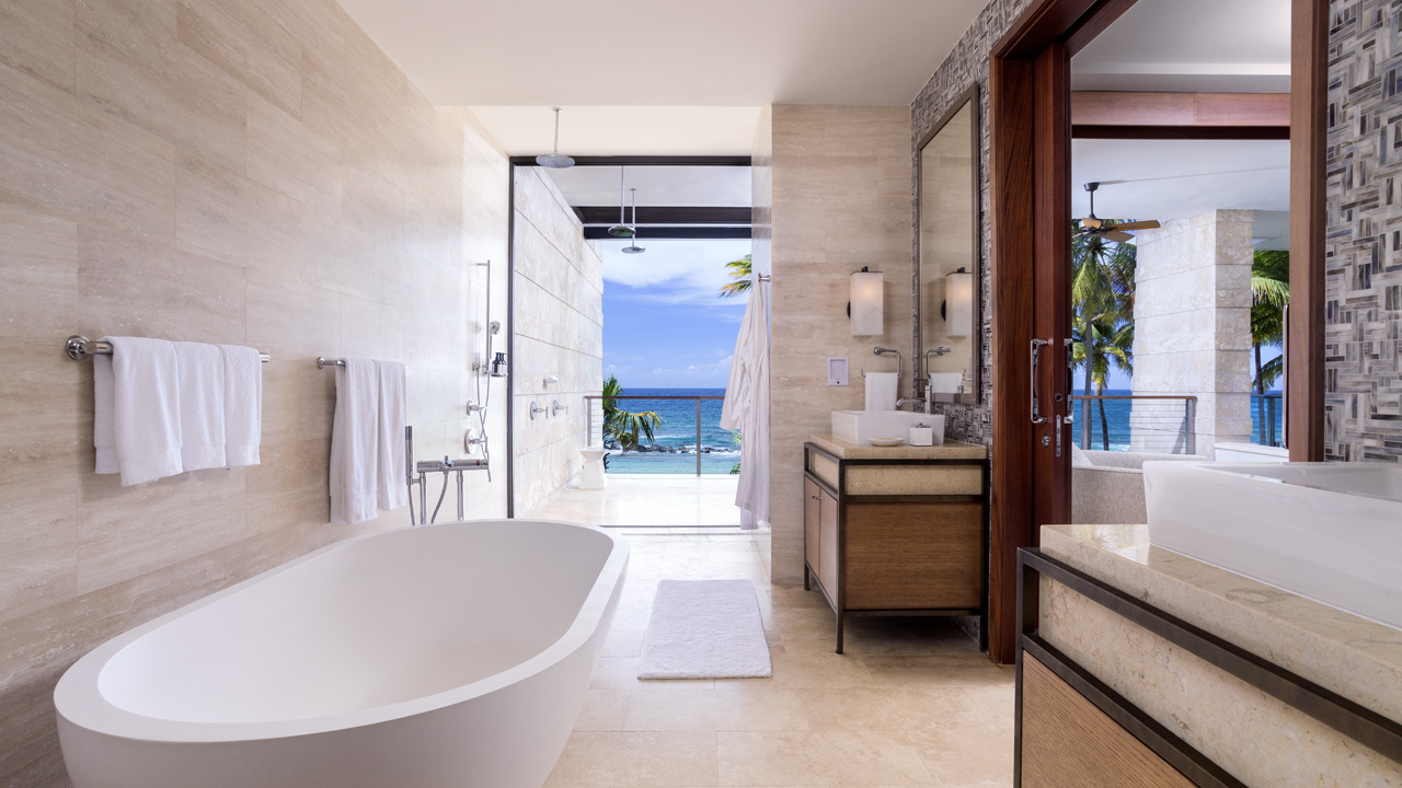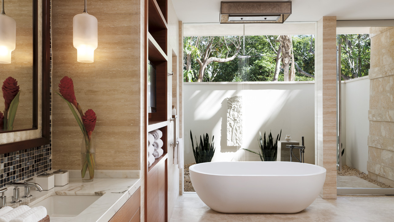 Ванная комната с двойной раковиной, ванной, отдельными душевыми кабинами с тропическим душем (один в ванной, другой на улице).