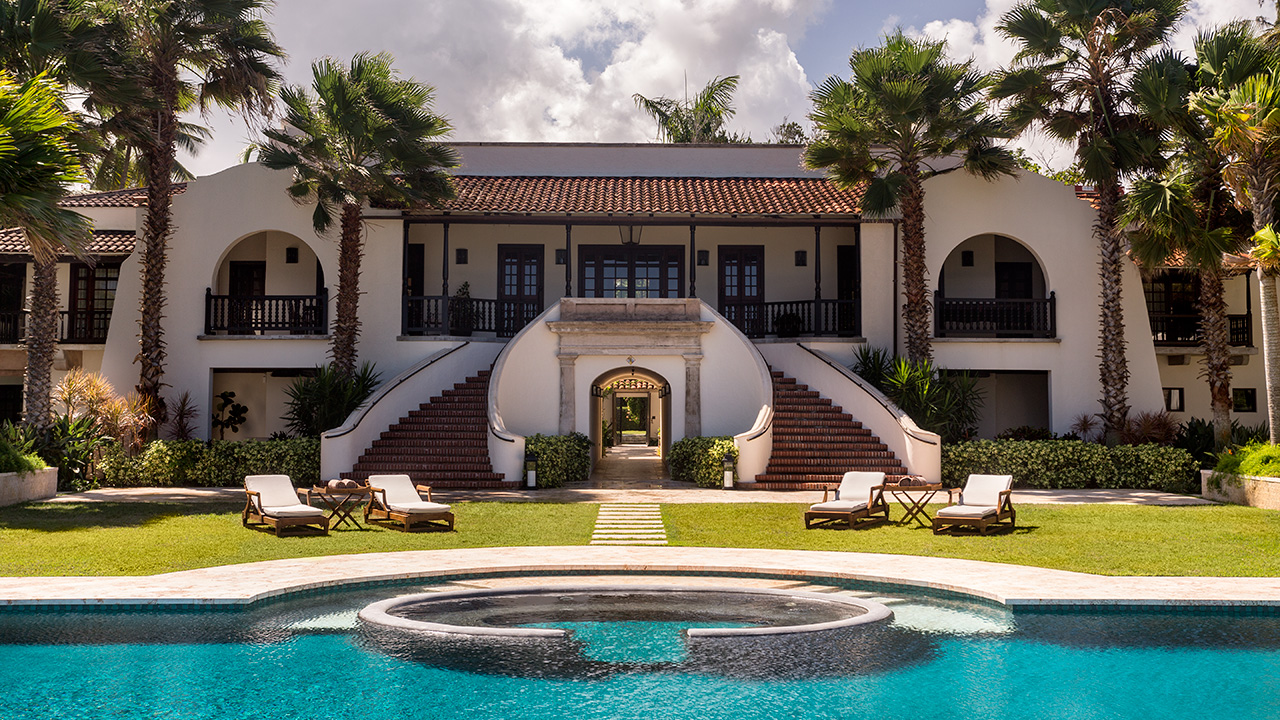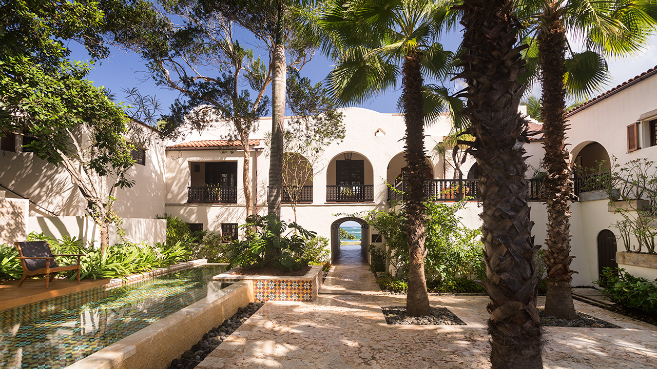 Богатый элегатный декор. Большой внутренний двор с прекрасными садами и бассейном с видом на океан. Здание построено в 1920 году и служило главным зданием усадьбы Рокфеллеров.