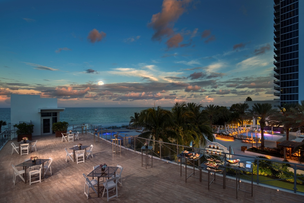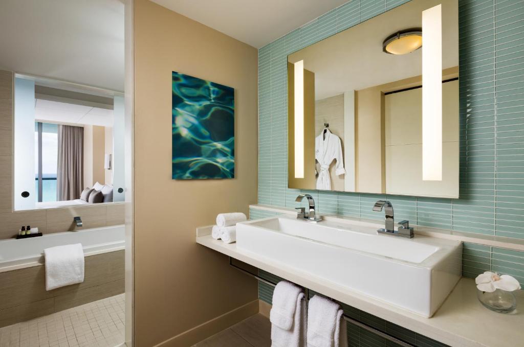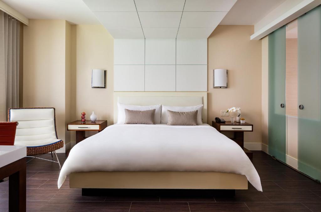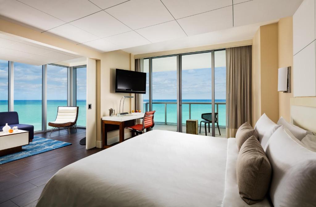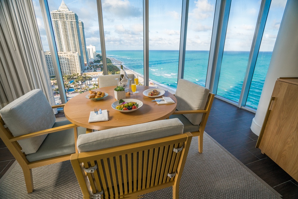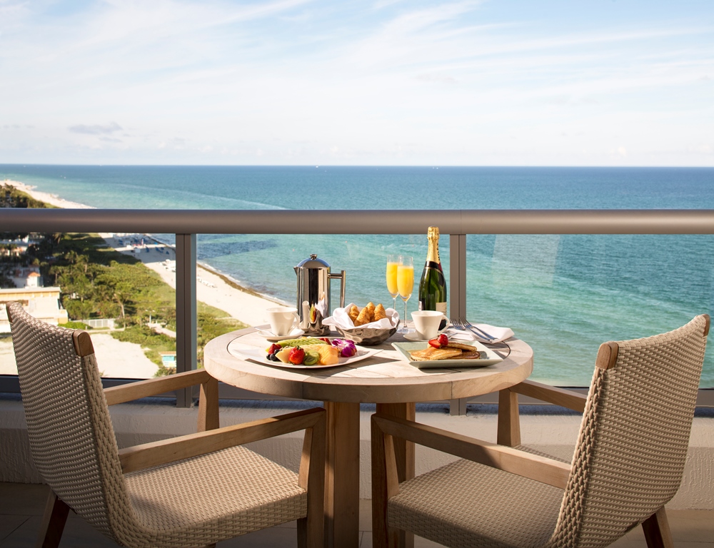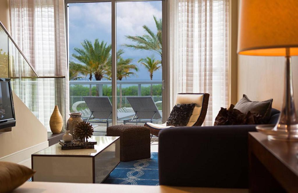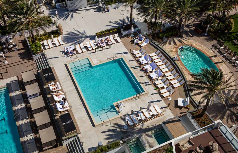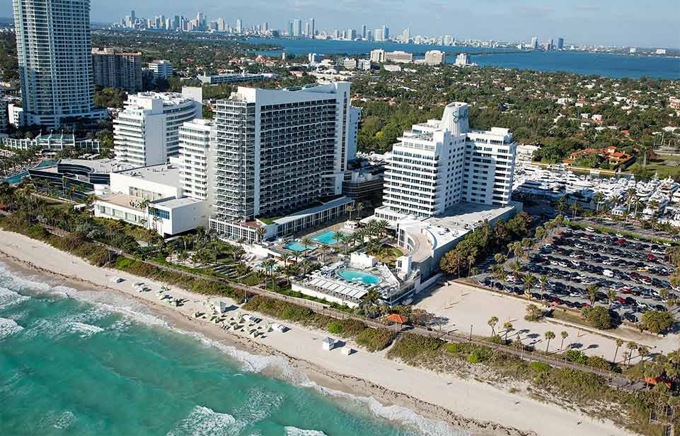 Отель стоит на пляже Mid-Beach чуть севернее шумного South Beach и занимает одно из знаковых модернистских зданий, построенных “главным” архитектором Майами, Морисом Лапидусом, в середине XX века.