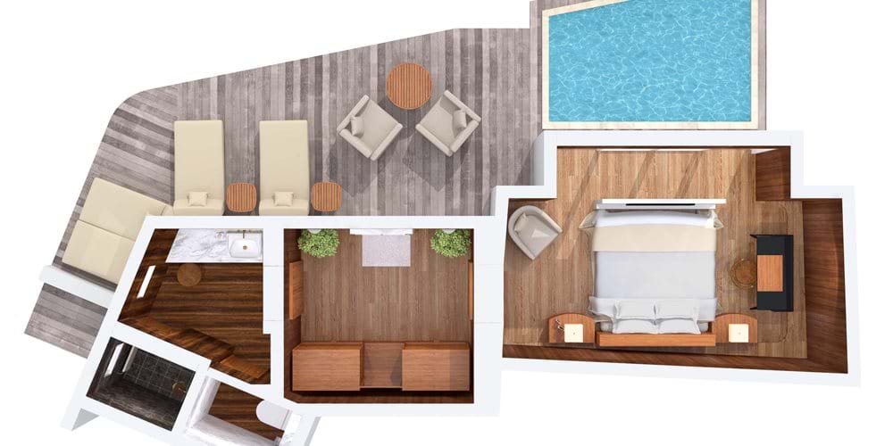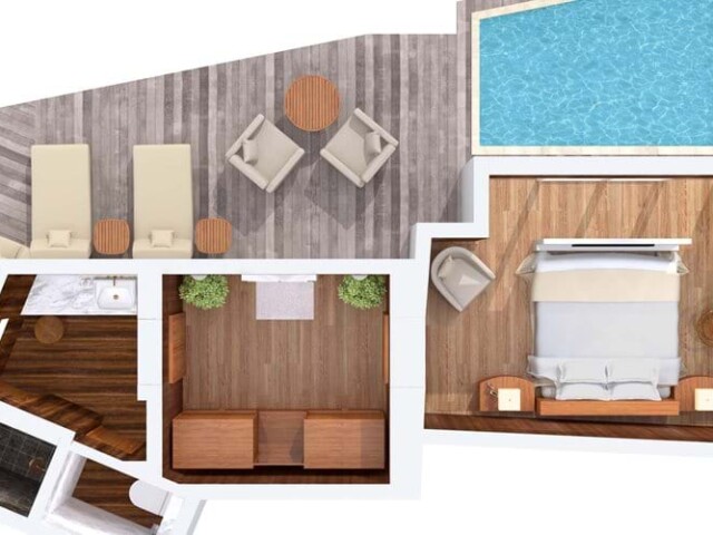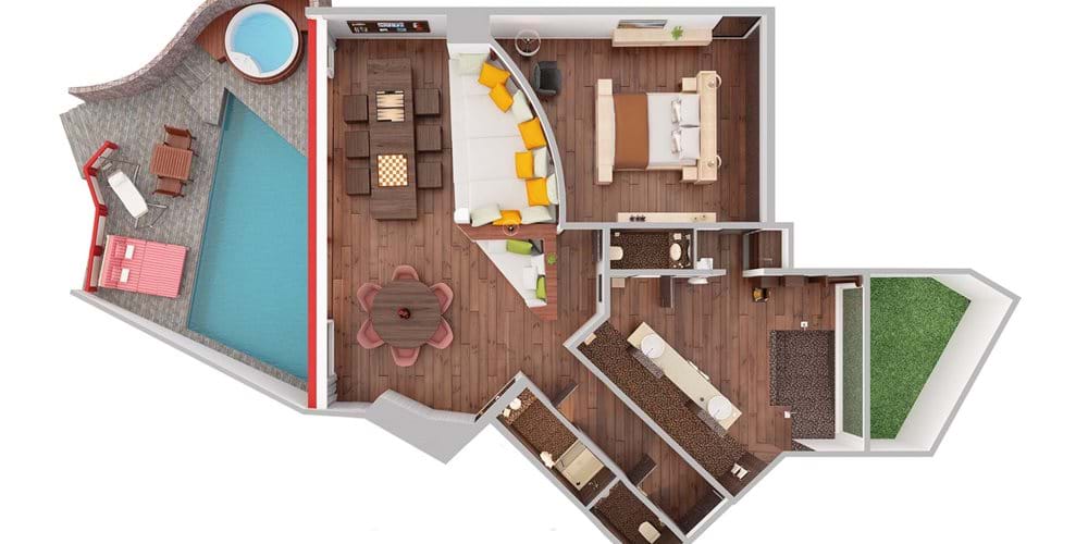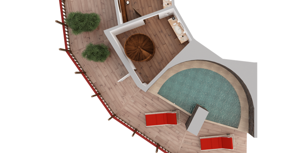 1 спальня, кухня, ванная комната с душевой кабиной, переходящая в террасу с джакузи и бассейном.