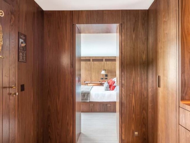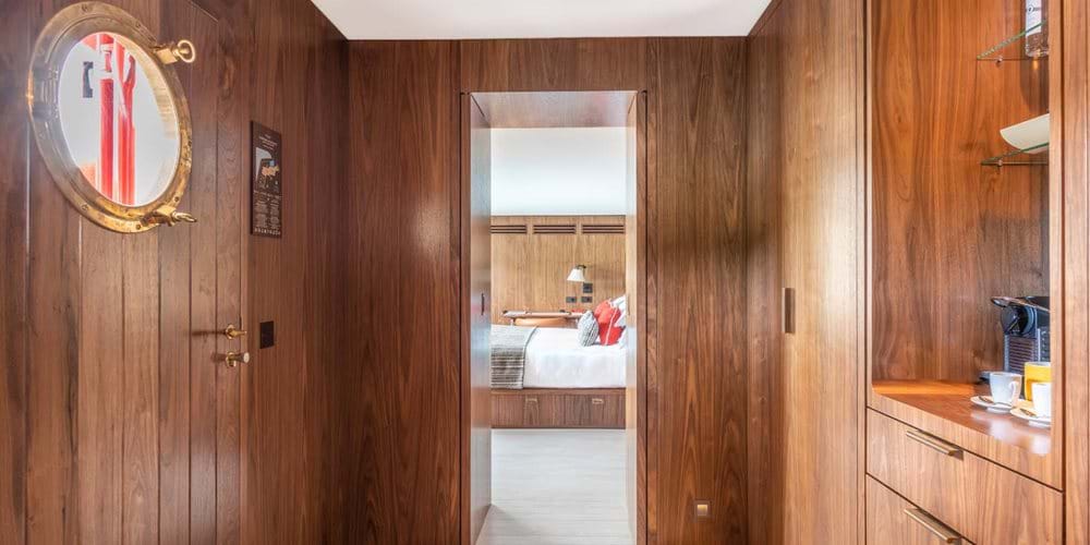 Номер декорирован тиковым деревом и выглядит как небольшая “наземная” яхта.