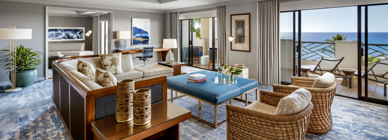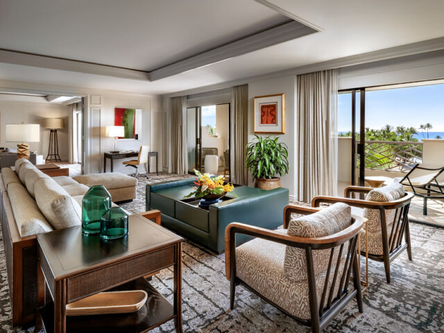 Hомер с красивым видом на пляж, лагуну, Тихий Океан и кокосовую рощу. В номере: Главная спальня: кровать с балдахином, небольшая зона отдыха с мягким креслом, выход на террасу. Гардеробная комната с туалетным столиком. Отделанная мрамором ванная комната с джакузи и отдельной душевой кабиной. Вторая комната: небольшая зона отдыха с мягким креслом, рабочий стол. Отделанная мрамором ванная комната с ванной и отдельной душевой кабиной.