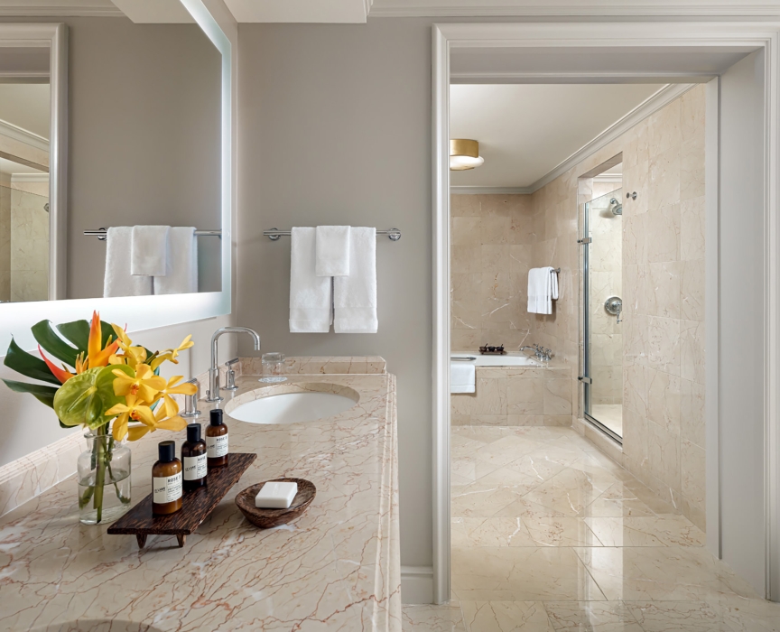 В номере: небольшая зона отдыха с мягким креслом, рабочий стол. Отделанная мрамором ванная комната с ванной и отдельной душевой кабиной.