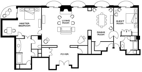 Просторный угловой номер в светлых тонах. Расположен в здании East Villa. В номере спальня, гардеробная, гостиная с мягкой мебелью и камином, столовая с обеденным столом на 14 персон. Раздвижные двери из гостиной, спальни и столовой ведут на большую меблированную террасу. Ванная комната, отделанная мрамором, с двойной раковиной, ванной и отдельной душевой кабиной, гостевой туалет.