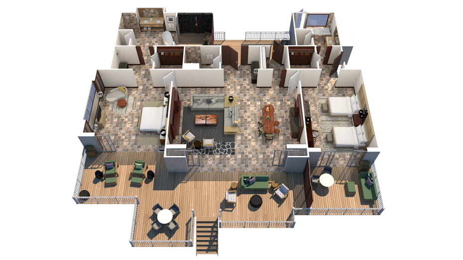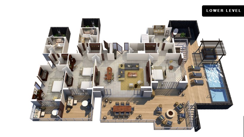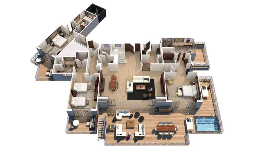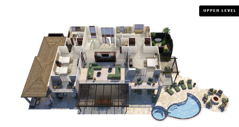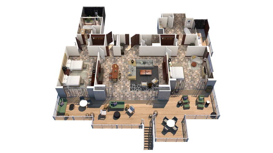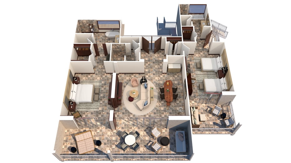 Расположены в зонах Palm Grove, King’s Pond, Sea Shell и Beach Tree crescents на верхних этажах бунгало. Просторные удобные номера, в декоре которых использованы лиственные породы дерева, стены украшены произведениями искусства местных авторов. Спальня, гостиная с обеденной зоной, ванная комната с ванной, отдельной душевой кабиной, душевой кабиной на улице, гостевой туалет, парная.