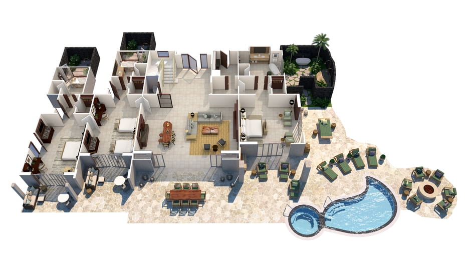Номера расположены на верхних уровнях бунгало в зонах King’s Pond; Sea Shell; Beach Tree и Palm Grove. Спальня, гостиная, ванная комната с ванной и отдельным душем, гостевой туалет с душем.