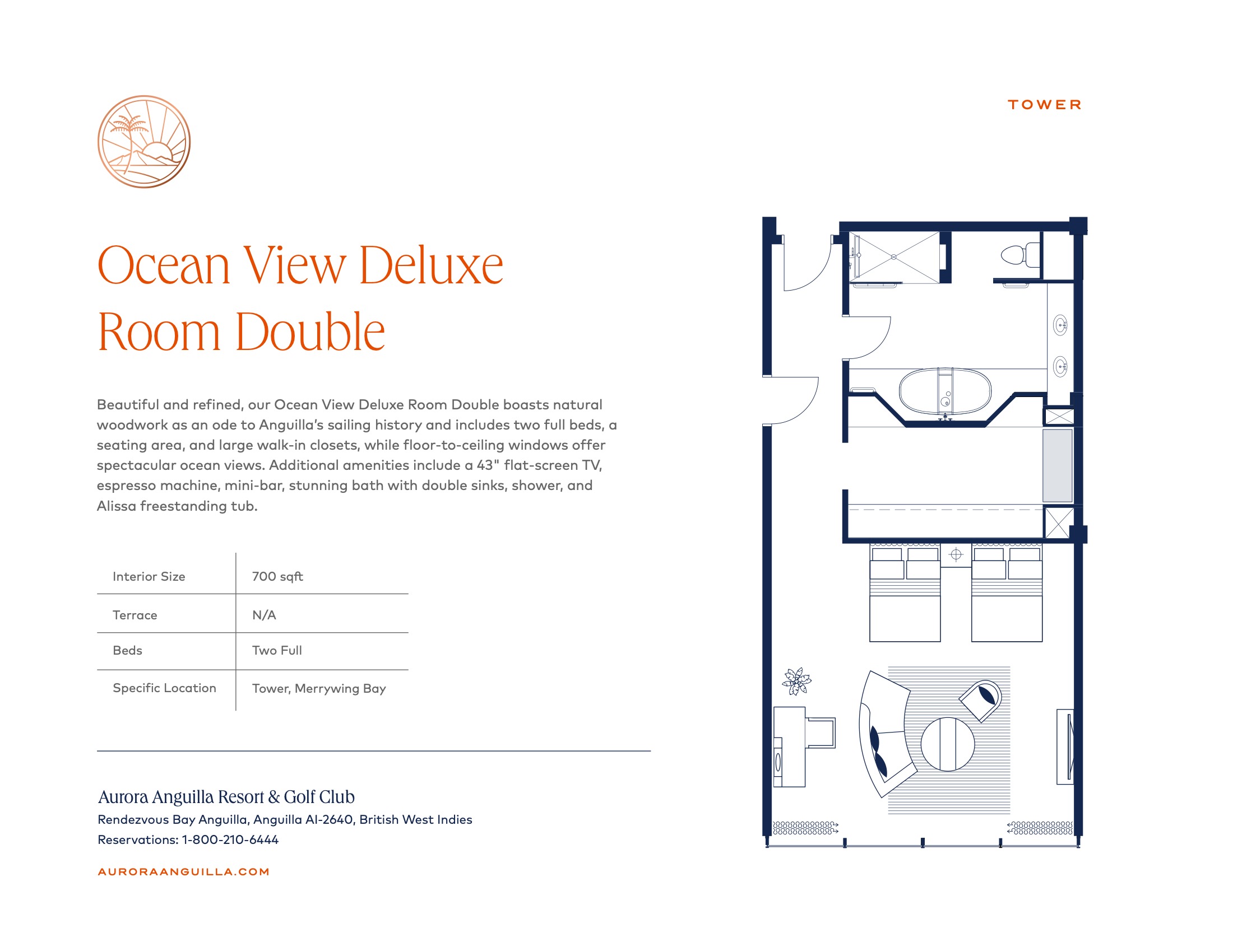 Номера расположены на нижних или верхних уровнях на Golf Ocean-View Crescent. Спальня, гостиная с обеденной зоной, ванная комната с ванной и душем, душевая кабина в саду в номерах на нижних уровнях, гостевой туалет с душем, в некоторых номерах есть паровой душ и душ-водопад.