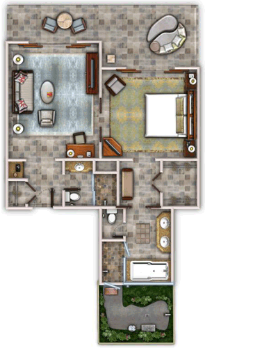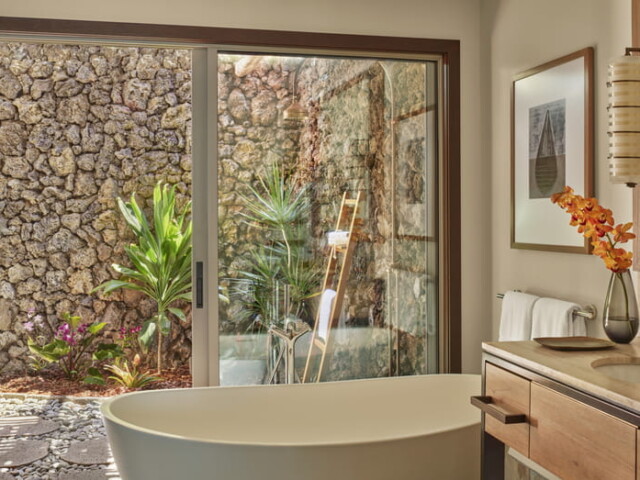 Номера расположены на нижних этажах бунгало в зоне Palm Grove. Спальня, просторная гостиная с рабочей зоной и обеденной зоной, ванная комната с ванной и отдельным душем, душевая кабина в саду, гостевой туалет с душем, парная.