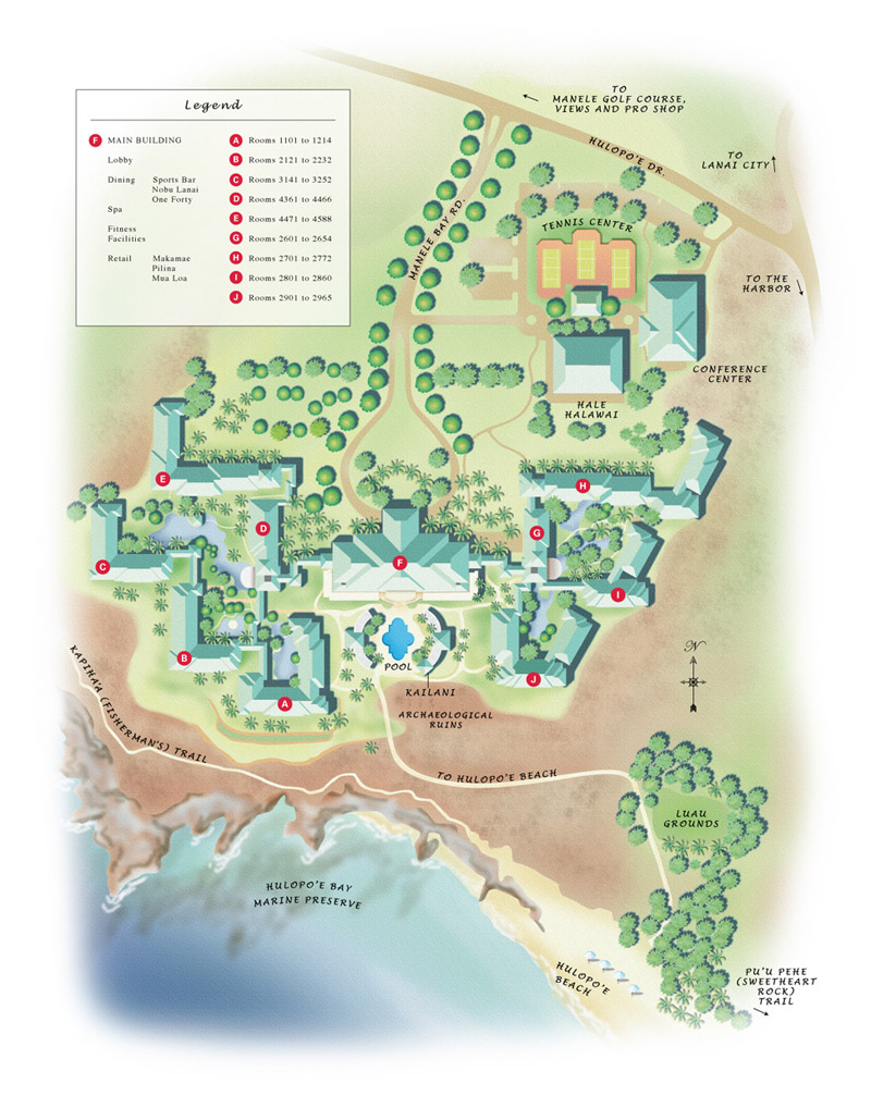 Пляж. Отель стоит на берегу морского заповедника Hulopoe Bay – отличного места для сноркелинга и дайвинга. Десятки видов морских обитателей, дельфины, горбатые киты. Оборудование для сноркелинга предоставляется бесплатно. Пляж полностью оборудован. Шезлонги, зонты и полотенца – бесплатно.