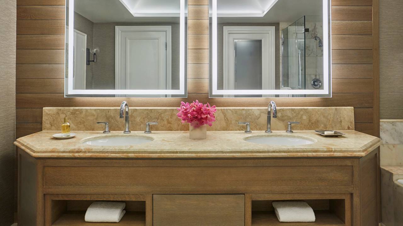 Номера на нижних этажах с более выйгрышными видами. Небольшая зона отдыха с мягкой мебелью, рабочий стол. Отделанная мрамором ванная комната с двойной раковиной, ванной и отдельной душевой кабиной.