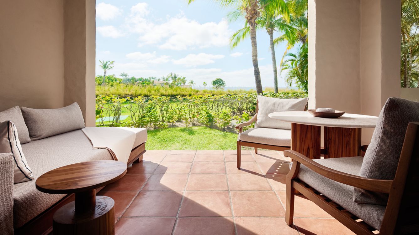 Номера расположены на нижних этажах отеля. Вид на тропический ландшафтный сад. Небольшая зона отдыха с мягкой мебелью, рабочий стол. Отделанная мрамором ванная комната с двойной раковиной, ванной и отдельной душевой кабиной.