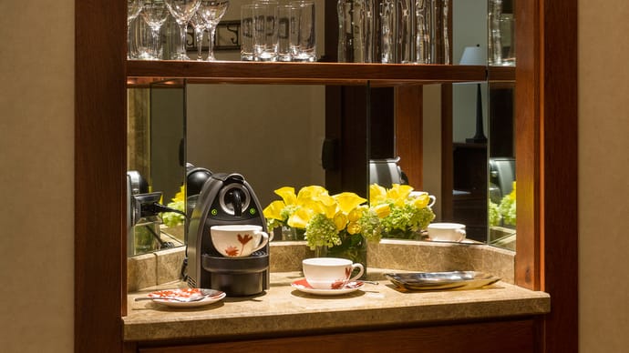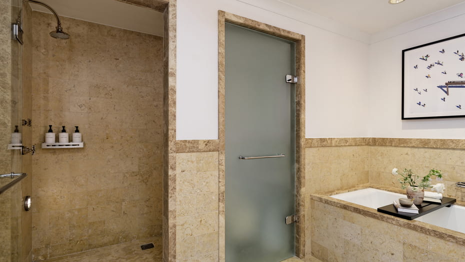 Комфортабельный просторный номер выполнен в теплых бежевых тонах, отделка деревом и натуральным камнем. В номере спальня с газовым камином, гостиная с мягкой мебелью и газовым камином, столовая с обеденным столом на 8-10 персон. Ванная комната с двойной раковиной, ванной и отдельной душевой кабиной, гостевой туалет.