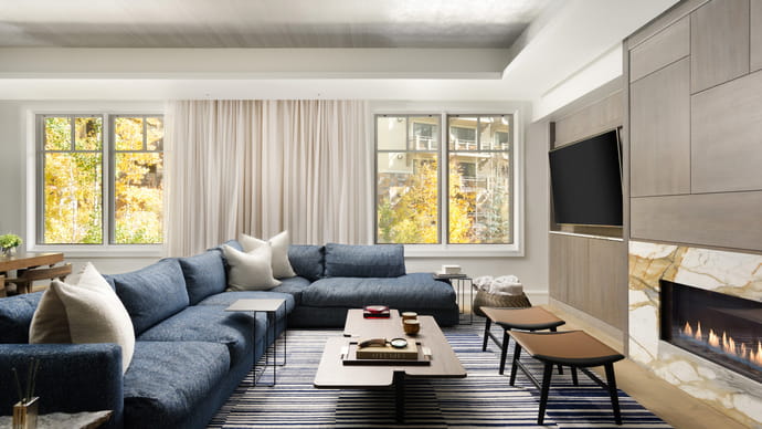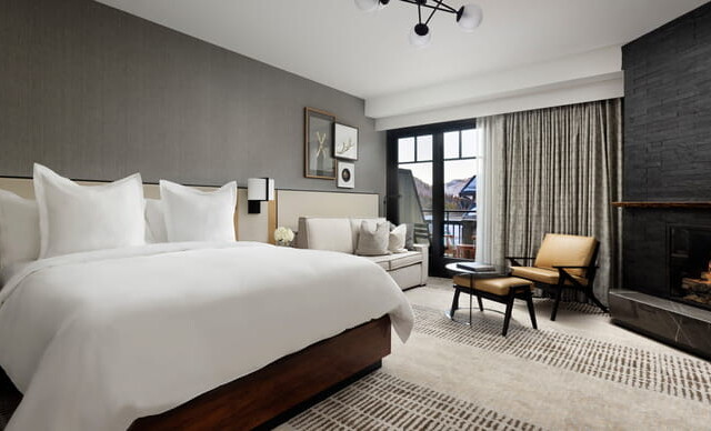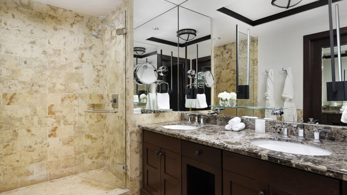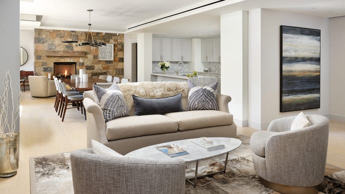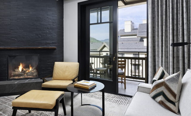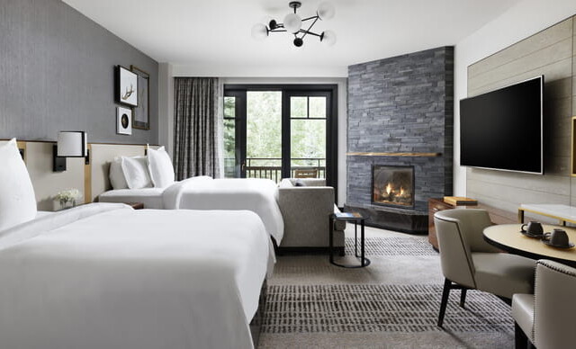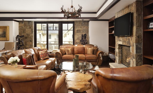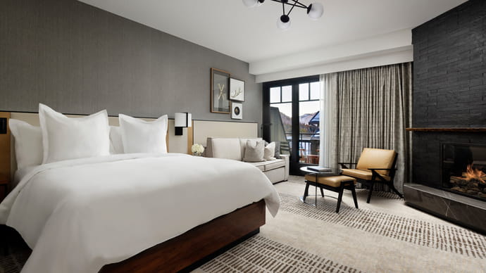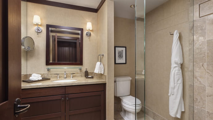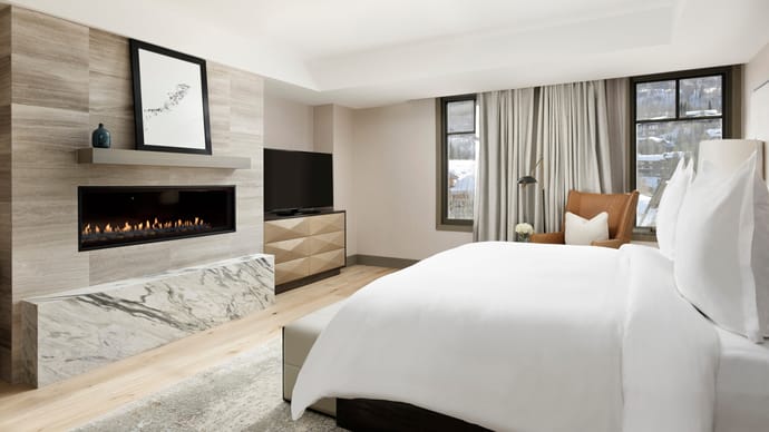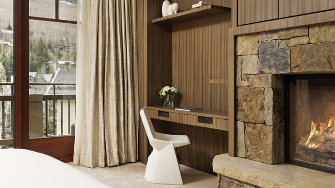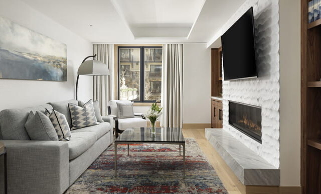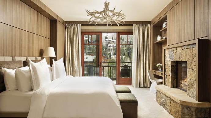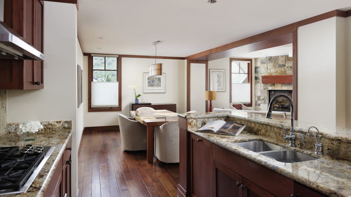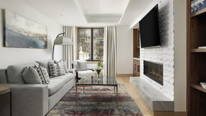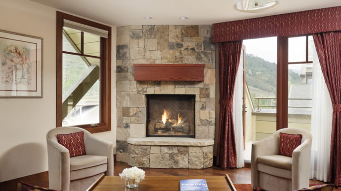Просторные стильные апартаменты в современном стиле с балконом. Теплые бежевые тона интерьера, отделка деревом и натуральным камнем. В номере спальня с газовым камином, гостиная с мягкой мебелью и камином, столовая с обеденным столом на 4 персоны, полностью оборудованная кухня. Дополнительная комната – den (небольшой кабинет или дополнительная маленькая спальня). Просторная ванная комната с двумя туалетными столиками, ванной и стеклянной душевой кабиной, гостевой туалет.