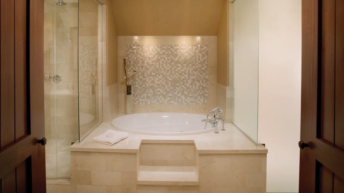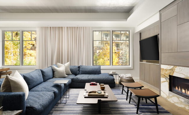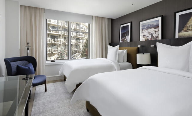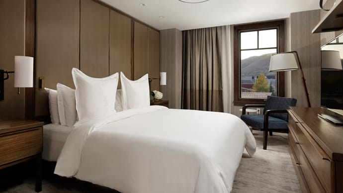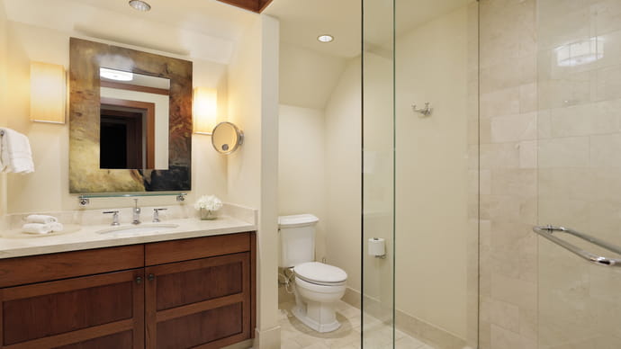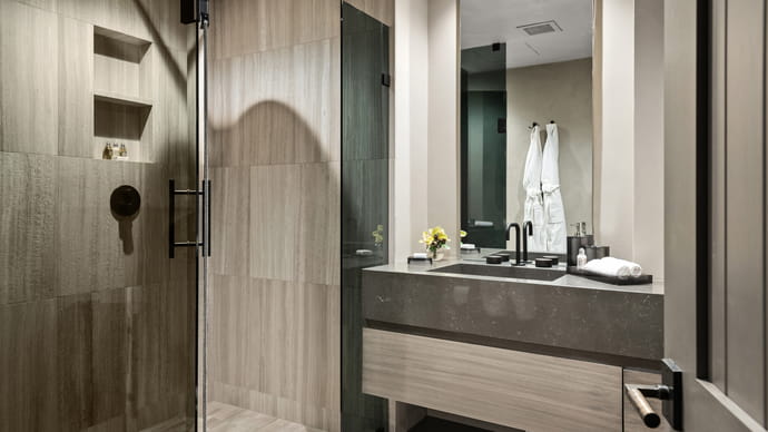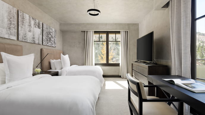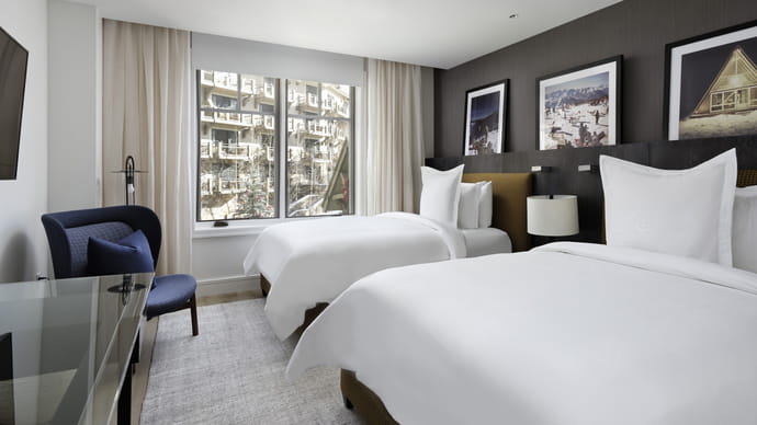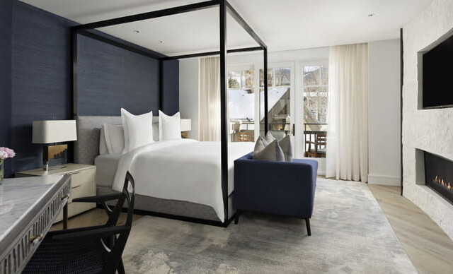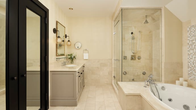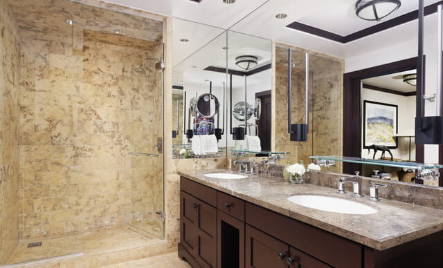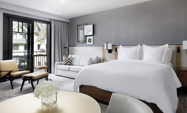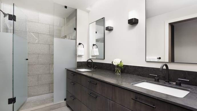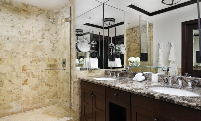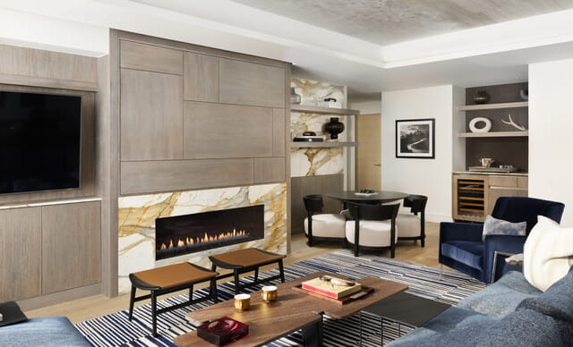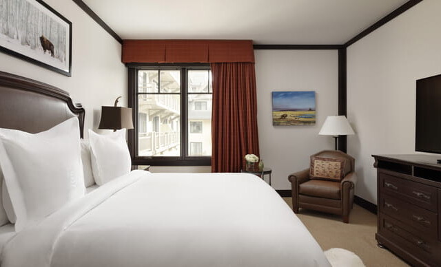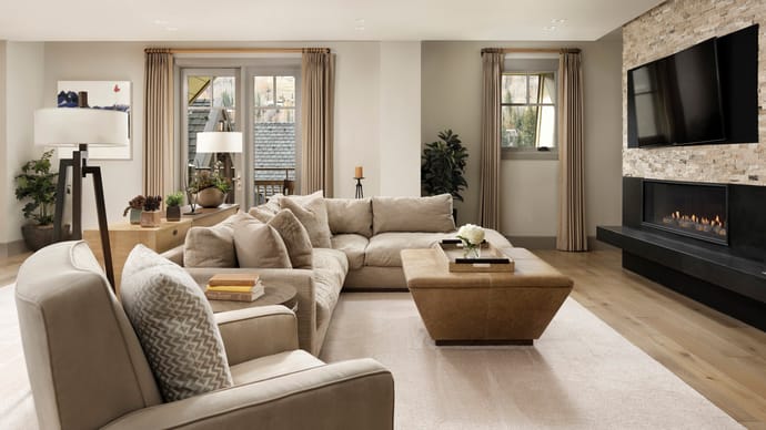 Просторные стильные апартаменты в современном стиле с балконом. Теплые бежевые тона интерьера, отделка деревом и натуральным камнем. В номере спальня с газовым камином, гостиная с мягкой мебелью и камином, столовая с обеденным столом на 4 персоны, полностью оборудованная кухня. Дополнительная комната – den (небольшой кабинет или дополнительная маленькая спальня). Просторная ванная комната с двумя туалетными столиками, ванной и стеклянной душевой кабиной, гостевой туалет.