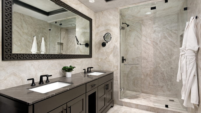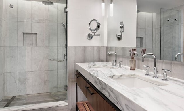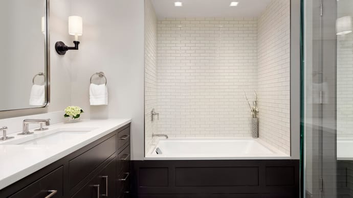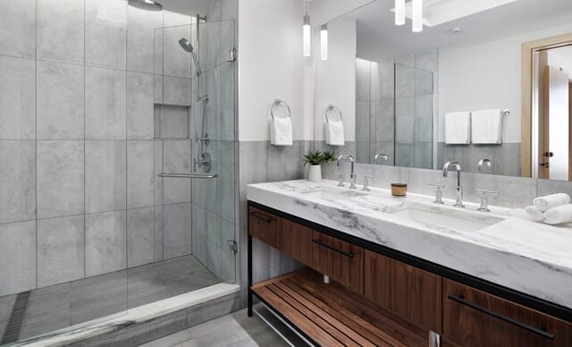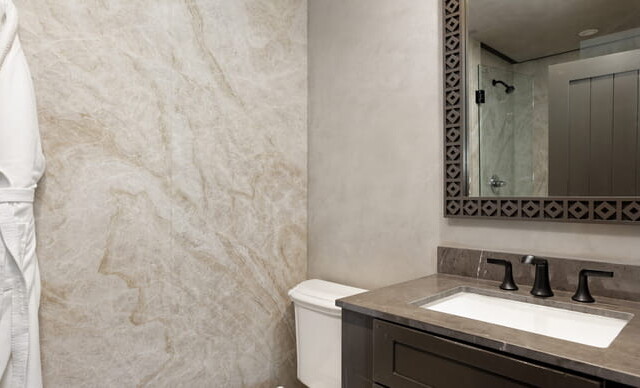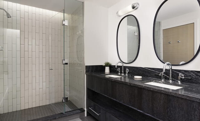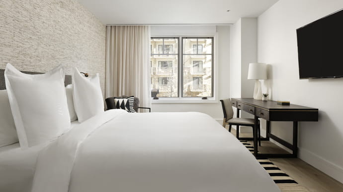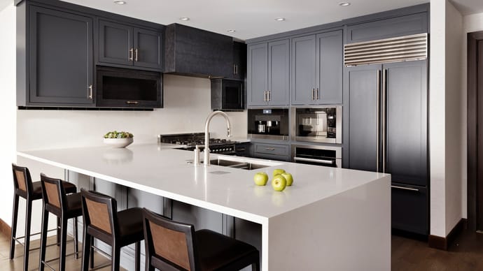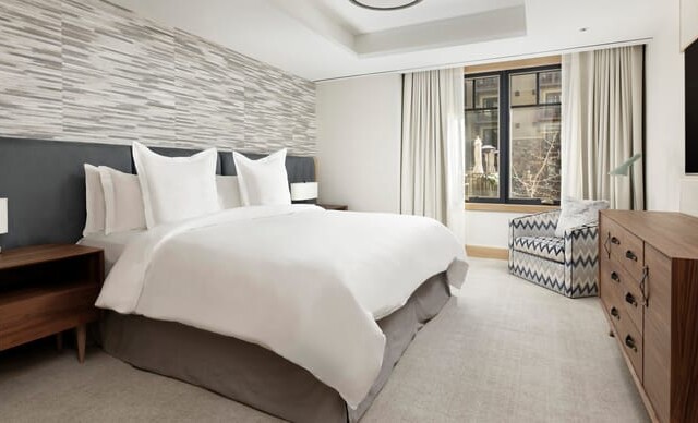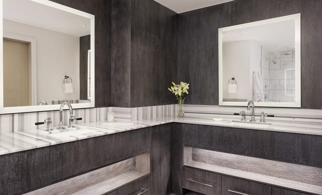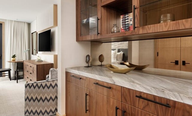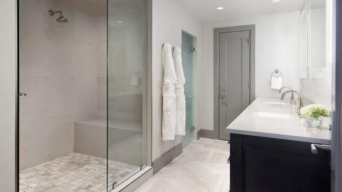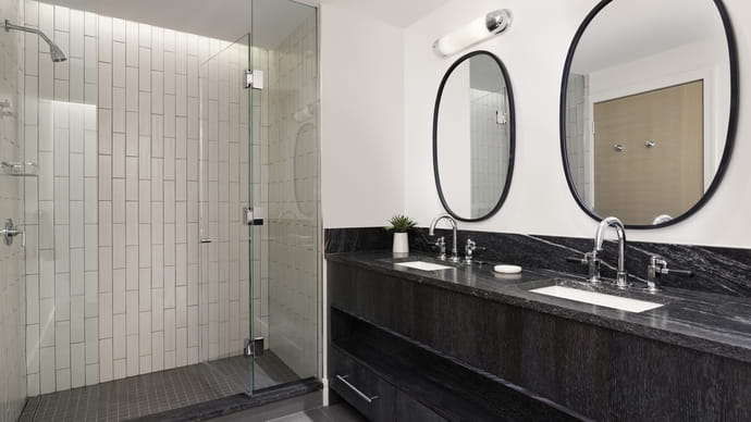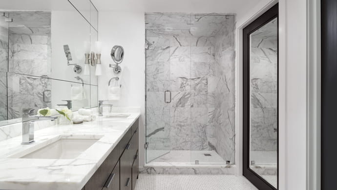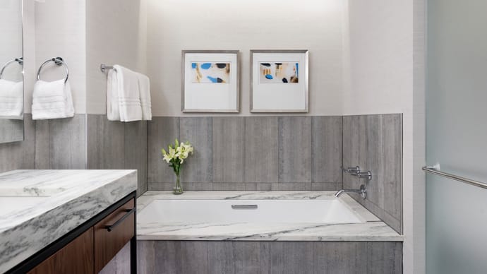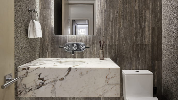 Просторные стильные апартаменты в современном стиле с балконом. Теплые бежевые тона интерьера, отделка деревом и натуральным камнем. В номере спальня с газовым камином, гостиная с мягкой мебелью и камином, столовая с обеденным столом на 4 персоны, полностью оборудованная кухня. Дополнительная комната – den (небольшой кабинет или дополнительная маленькая спальня). Просторная ванная комната с двумя туалетными столиками, ванной и стеклянной душевой кабиной, гостевой туалет.