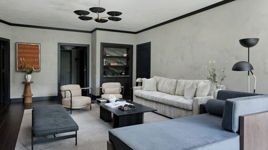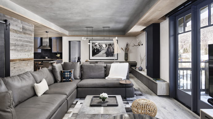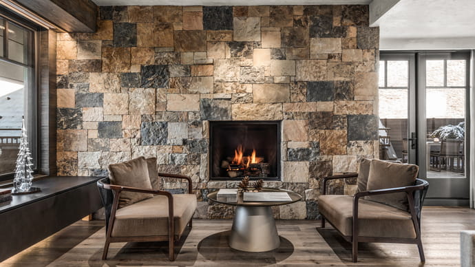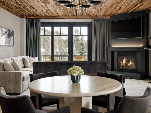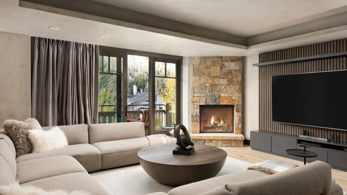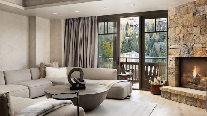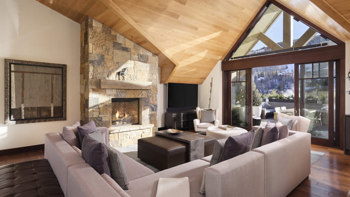 Стильные апартаменты в современном стиле выполнены в натуральных серо-бежевых тонах с отделкой деревом и натуральным камнем. В номере просторная гостиная с камином и мягкой мебелью, полностью оборудованная кухня, обеденная зона со столом на 8 персон, 3 спальни, одна из которых с камином, 3 ванные комнаты, гостевой туалет.