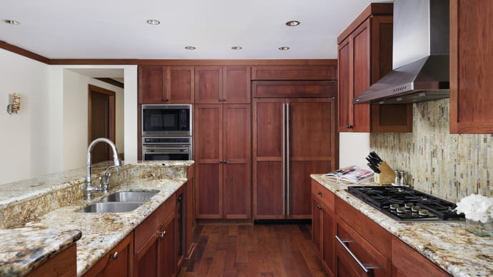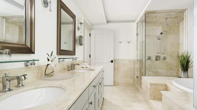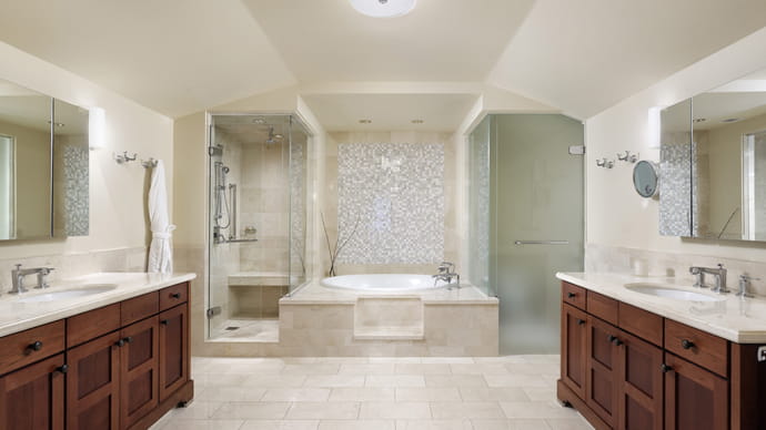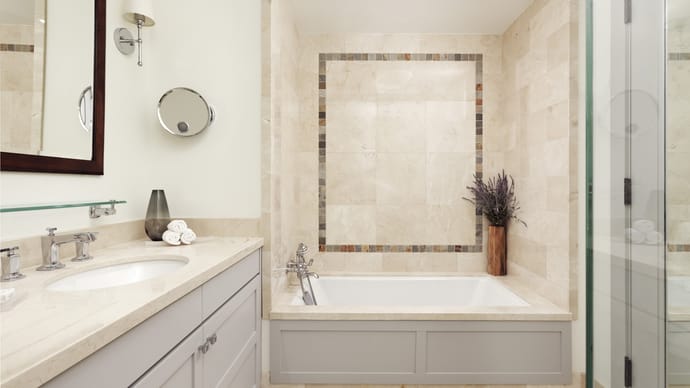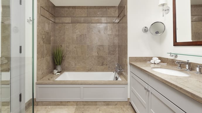 Просторный номер с двумя спальнями. Теплые бежевые тона в интерьере, отделка деревом и натуральным камнем. Большая гостиная с мягкой мебелью, обеденным столом на 8 персон, полностью оборудованная кухня. В главной ванной комнате отдельный душ и ванная, двойная раковина. Вторая ванная комната с душем и отделенным туалетом.