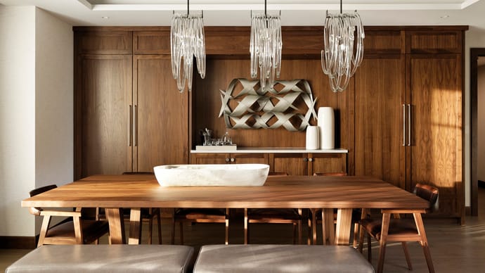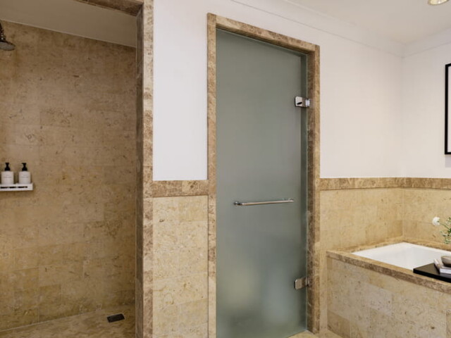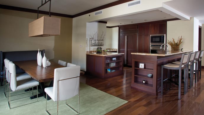 Просторный номер с тремя спальнями. Теплые бежевые тона интерьера, отделка деревом и натуральным камнем. Большая гостиная с зоной отдыха, обеденным столом для 8 человек, барной стойкой. Оборудованная кухня. В главной ванной комнате отдельный душ и ванная, двойная раковина. Две ванных комнаты с душем.