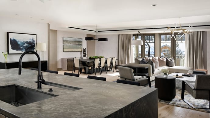 Стильные апартаменты в современном стиле выполнены в натуральных светлых тонах с яркими акцентами с отделкой деревом и натуральным камнем. В номере просторная гостиная с камином и мягкой мебелью, полностью оборудованная кухня, обеденная зона со столом на 8 персон, 3 спальни. Две ванные комнаты, гостевой туалет.