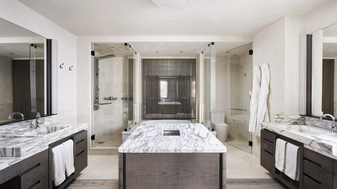 Стильные апартаменты в современном стиле выполнены в натуральных светлых тонах с отделкой деревом и натуральным камнем. В номере 5 спален, гардеробная, просторная гостиная с мягкой мебелью, столовая с обеденным столом на 10 персон, полностью оборудованная кухня, 5 ванных комнат.