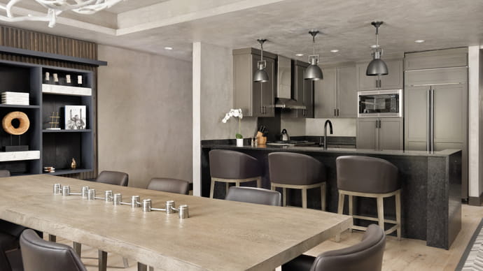 Двухуровневый номер с пятью спальнями. Светло-серые натуральные тона в интерьере, отделка деревом и натуральным камнем. Большая гостиная с мягкой мебелью, столовая с обеденным столом на 10 персон, полностью оборудованная кухня, 5 ванных комнат.