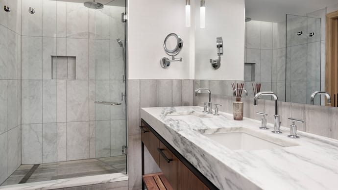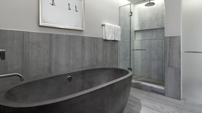 Комфортабельный просторный номер выполнен в серых тонах, отделка деревом и натуральным камнем. В номере зона отдыха, газовый камин. Балкон или терраса в большинстве номеров. Ванная комната с двойной раковиной, ванной и отдельной душевой кабиной.