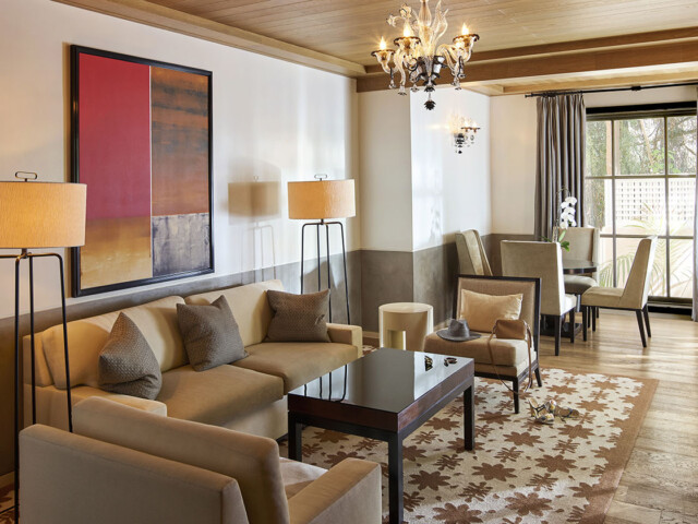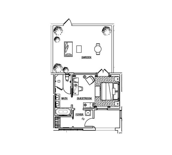 Один из самых больших номеров отеля. В номере 2 спальни, гостиная с мягкой мебелью, камином, столовая. Французские двери ведут на меблированное патио с обеденным столом в тени деревьев. 2 ванные комнаты, одна из которых с джакузи и душевой кабиной, подогреваемый пол.