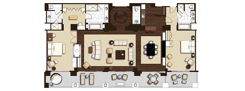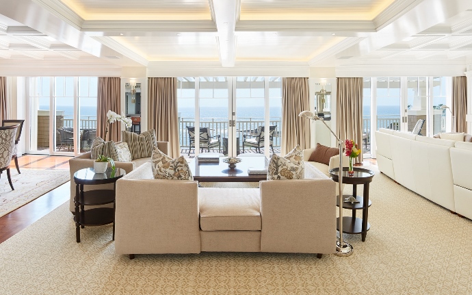 Роскошный номер с большим меблированным балконом с панорамным видом на океан. В номере две спальни, гостиная с двусторонним камином, мягкой мебелью, кухней, столовой со столом на 8 персон, большая гардеробная комната. Три ванные комнаты, гостевой туалет.