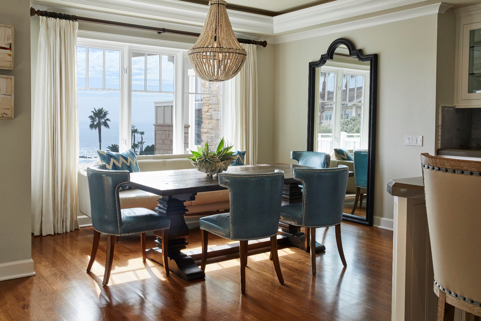 Обеденный стол в помещении и обеденная зона на улице.