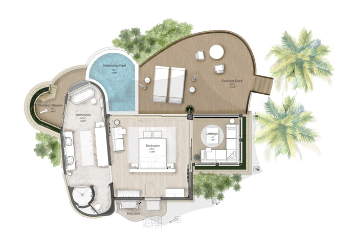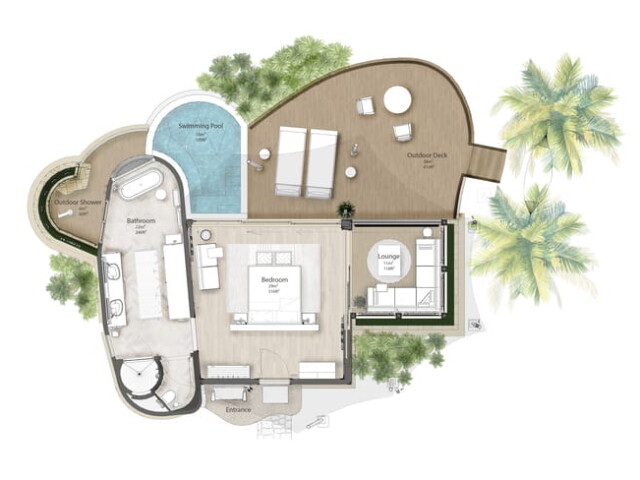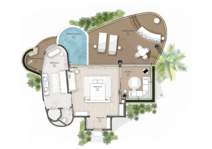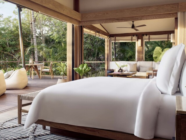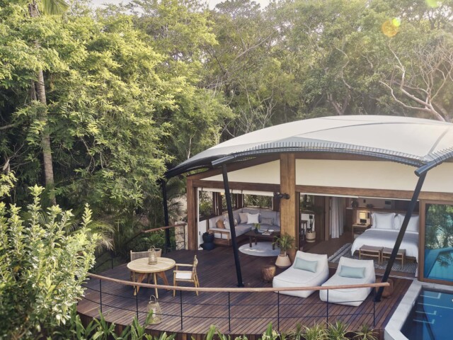 В отеле всего 15 номеров, каждый с бассейном и большой террасой. Инфраструктура включает ресторан, большой бассейн, собственный уединенный пляж, спа с индивидуальными спа-капсулами, темаскаль, павильон для йоги и тренажерный зал под открытым небом.