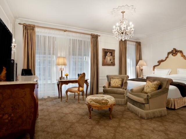 Элегантные номера в классическом стиле. Роскошные хрустальные люстры, картины на стенах, мебель из натурального дерева. Ванные комнаты отделаны мрамором и мозаичной плиткой из натурального камня. Детали интерьера покрытыми золотом в 24 карата. Вместительный гардероб.
