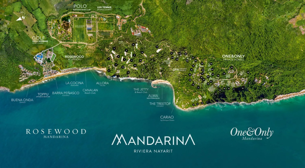 Mandarina объединяет несколько эксклюзивных проектов, включая отели One&Only Mandarina, Rosewood Mandarina, а также частные виллы и резиденции. В ближайшие годы поблизости откроются отели брендов Belmond и Edition.
