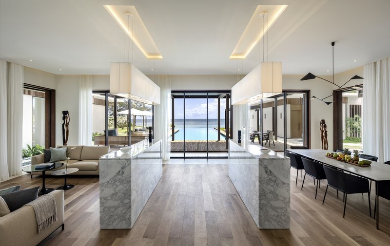 Открытая планировка большой гостиной и столовой обрамлена 20-метровым бассейном, прямо за которым начинается пляж.