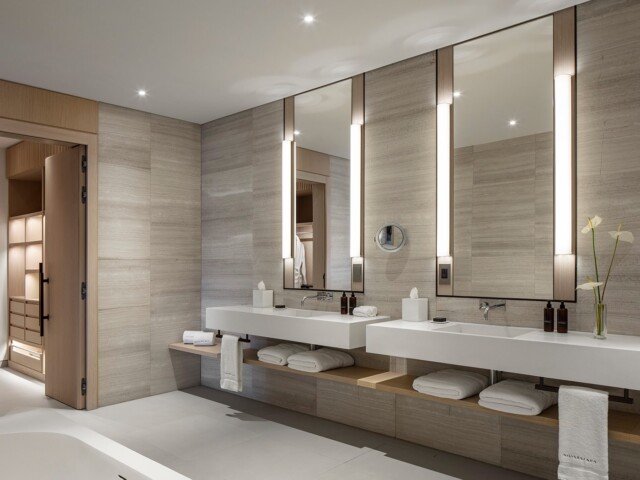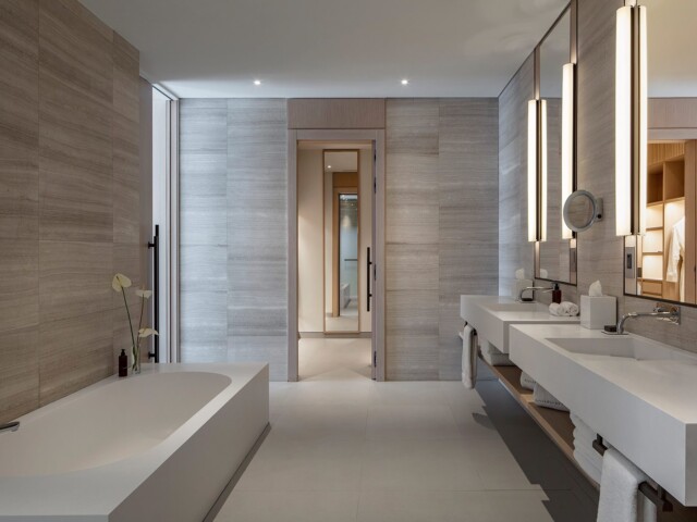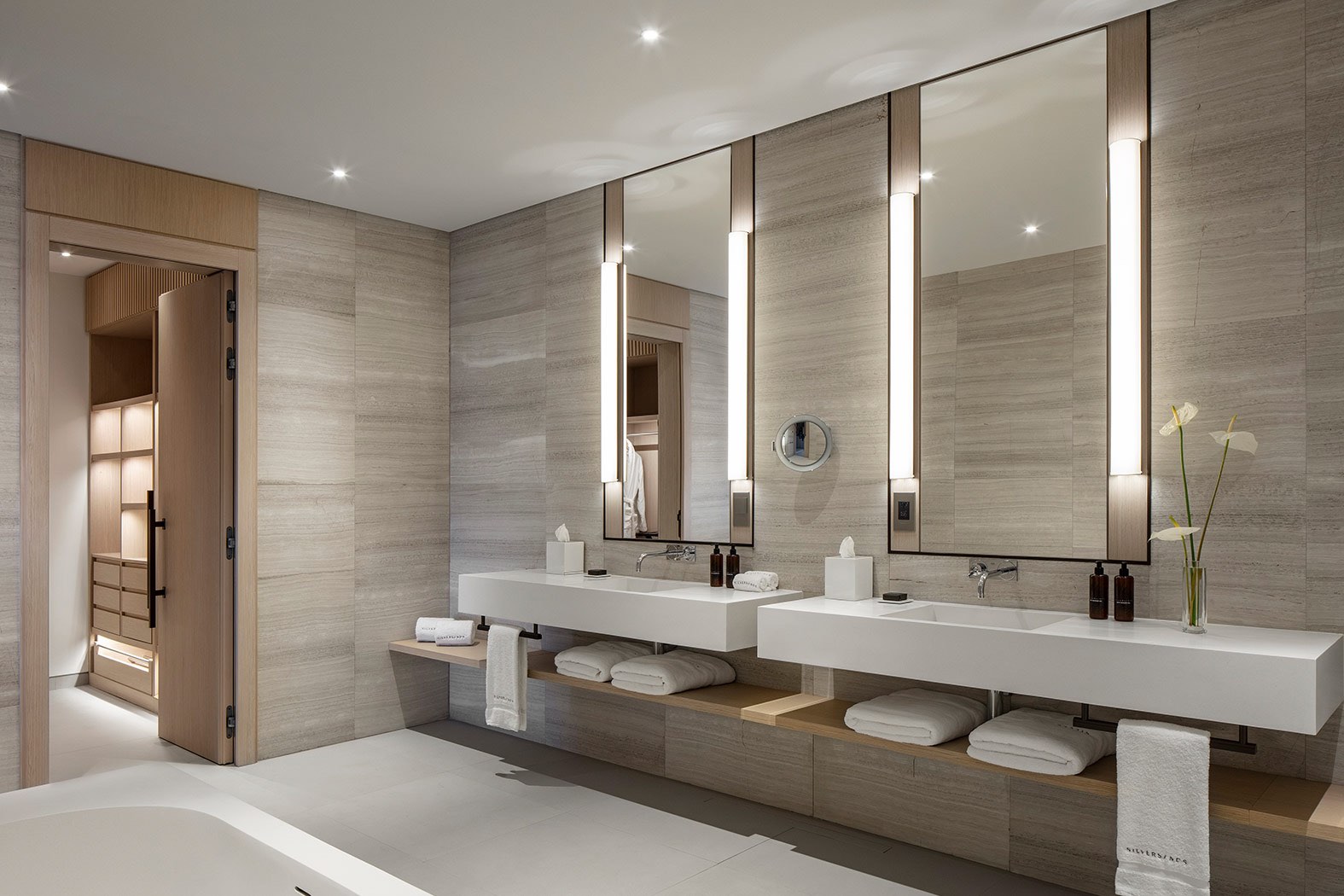 В ванной комнате двойной туалетный столик, две раковины, глубокая ванна и отдельная душевая.
