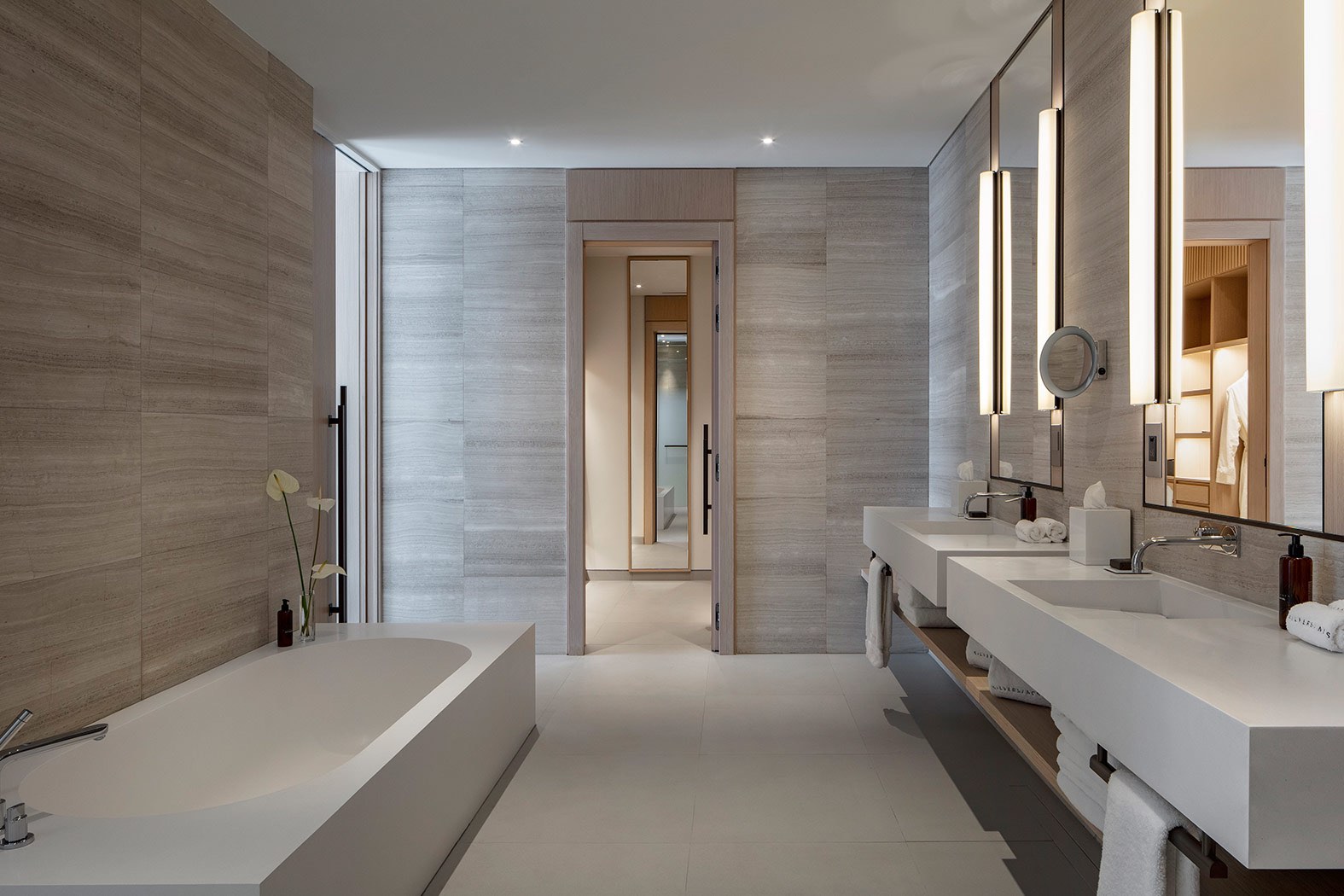 большая ванная комната с двумя раковинами, глубокой ванной и отдельной душевой в каждой из спален,