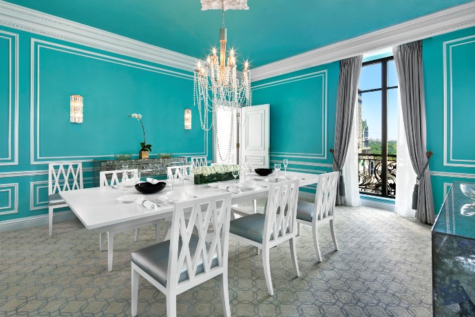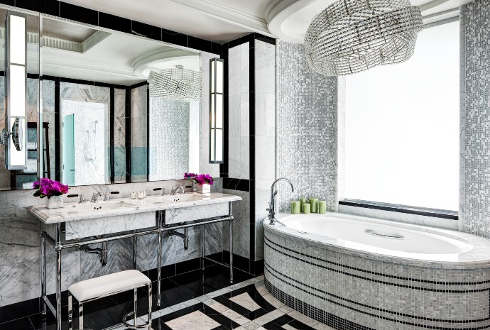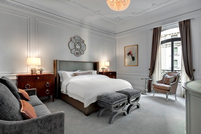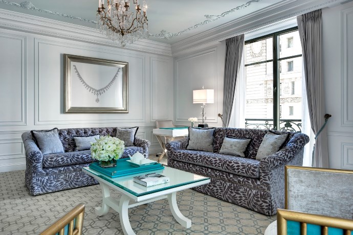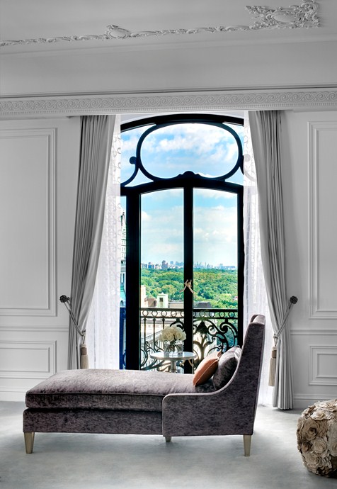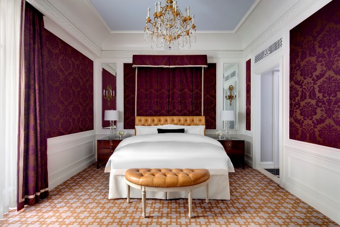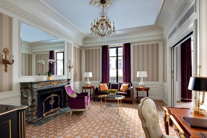 Роскошный номер в современном классическом стиле: потолки с лепниной, украшенные гобеленами стены, хрустальные канделябры, овальные окна с красивыми видами на Нью-Йорк.