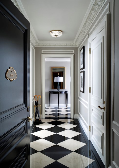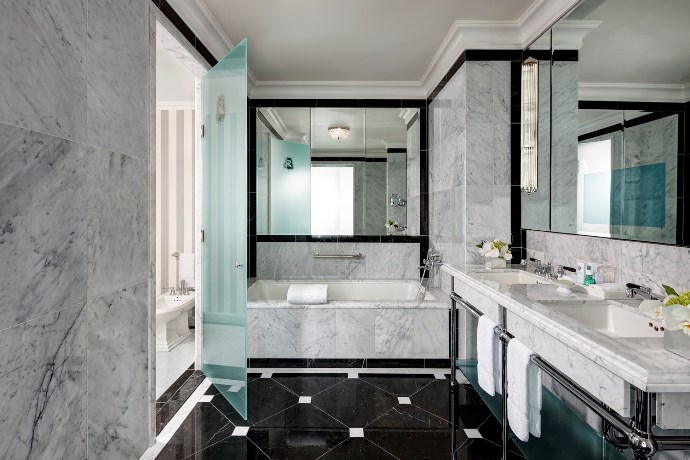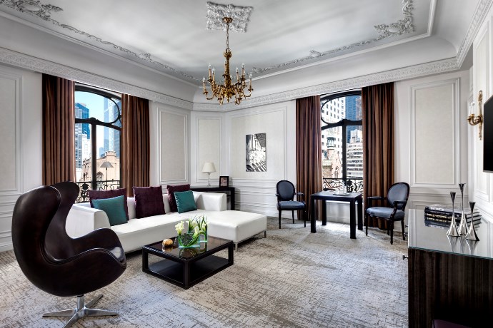 В отделке использованы натуральные шелк и кожа, высокие потолки украшены лепниной. В номере спальня, гостиная с рабочим столом и зоной отдыха с мягкой мебелью. Две ванные комнаты с двойной раковиной, ванной и отдельной душевой кабиной.