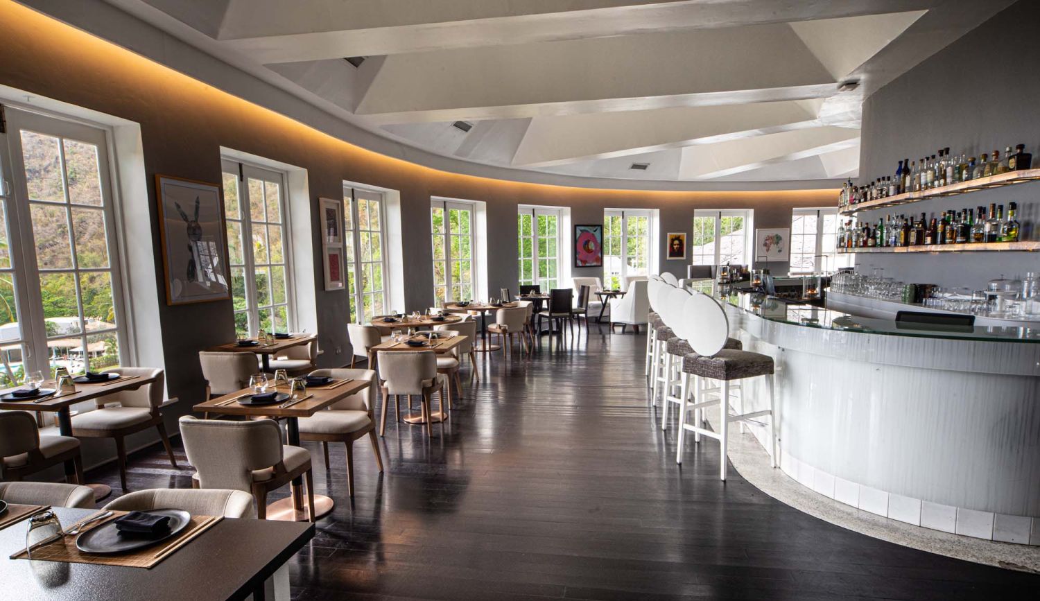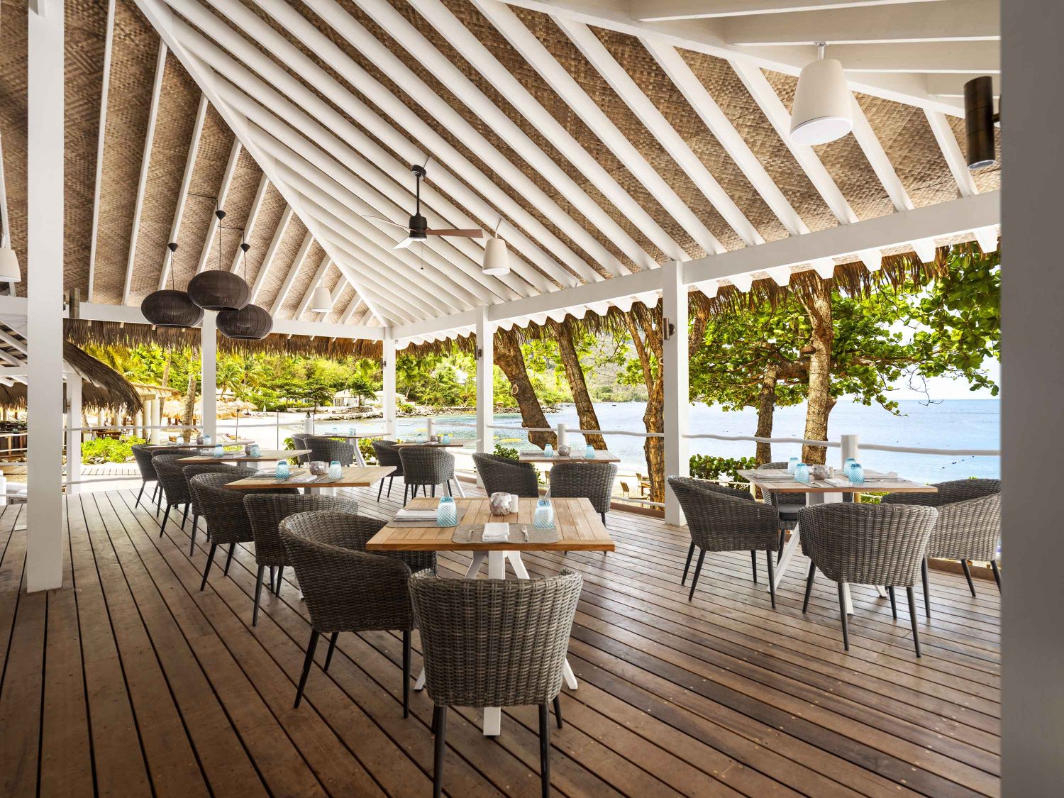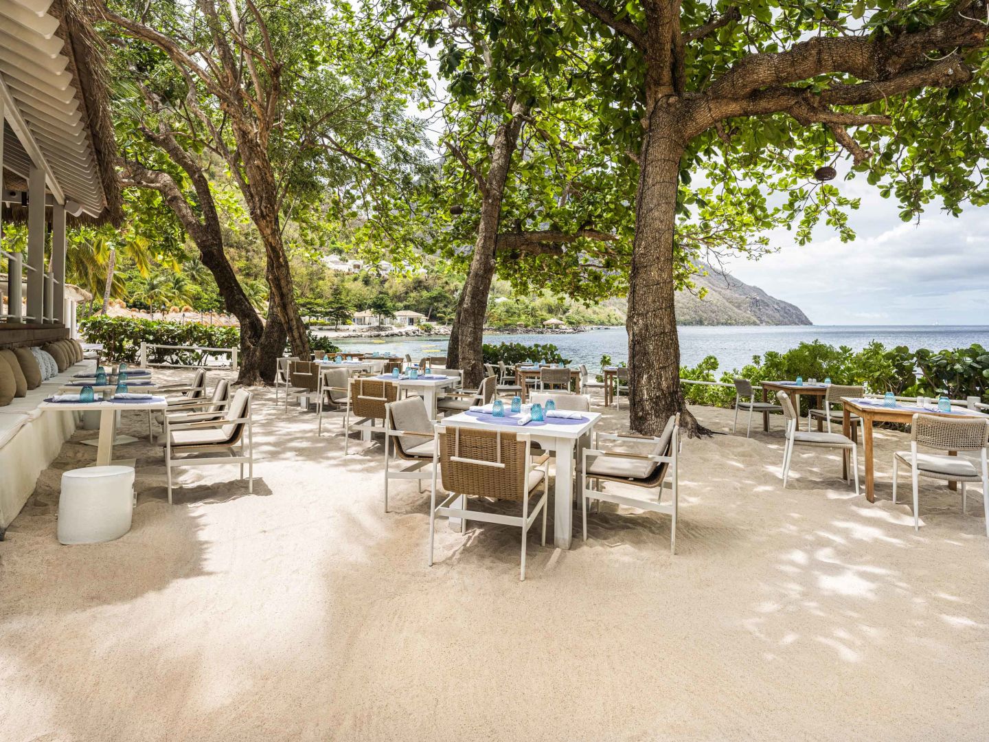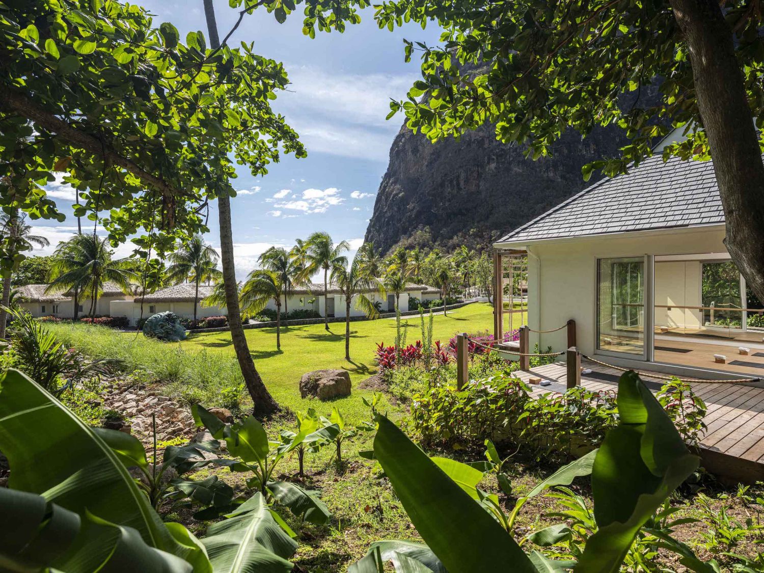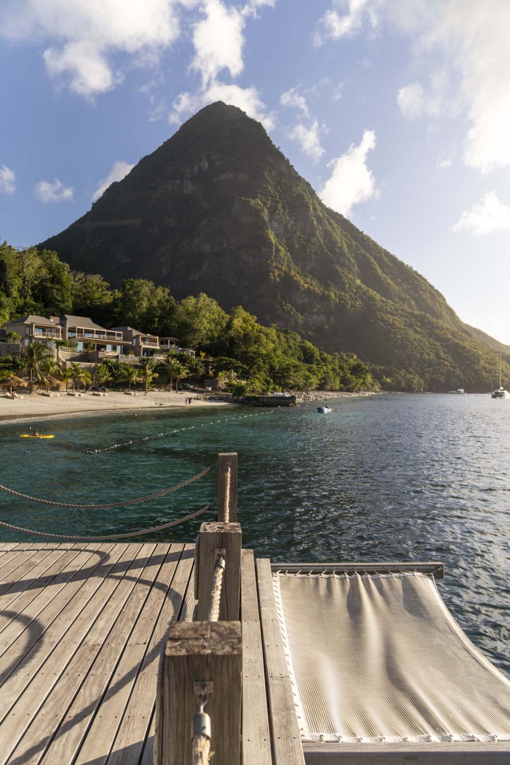 Один из лучших курортных комплексов на острове стоит на западном, карибском, побережье острова, вдали от порта и шумной столицы в долине между горами Pitons. Отель выходит к собственной бухте с прекрасным белым пляжем, море здесь всегда спокойное и температура воды круглый год около 24 – 26 С. Общая площадь курорта более 40 гектаров.