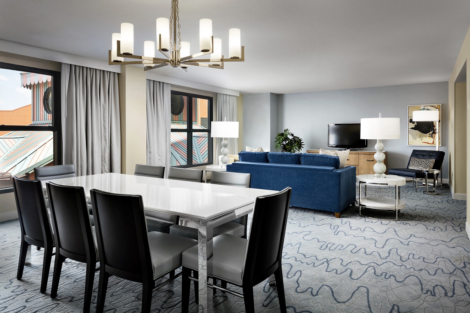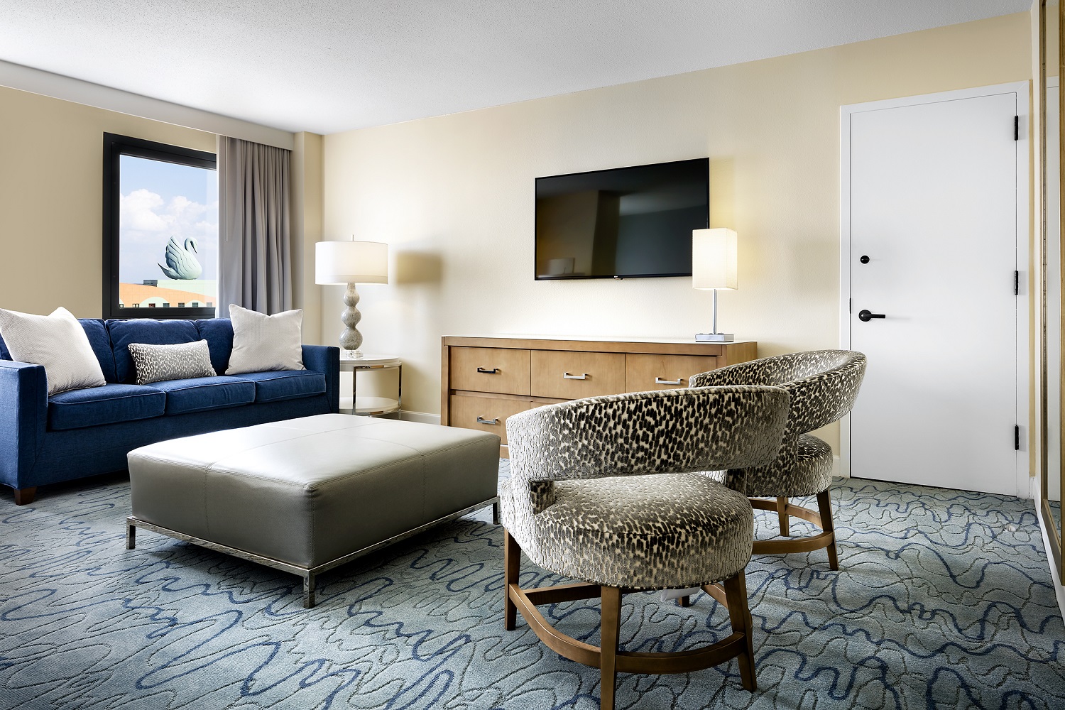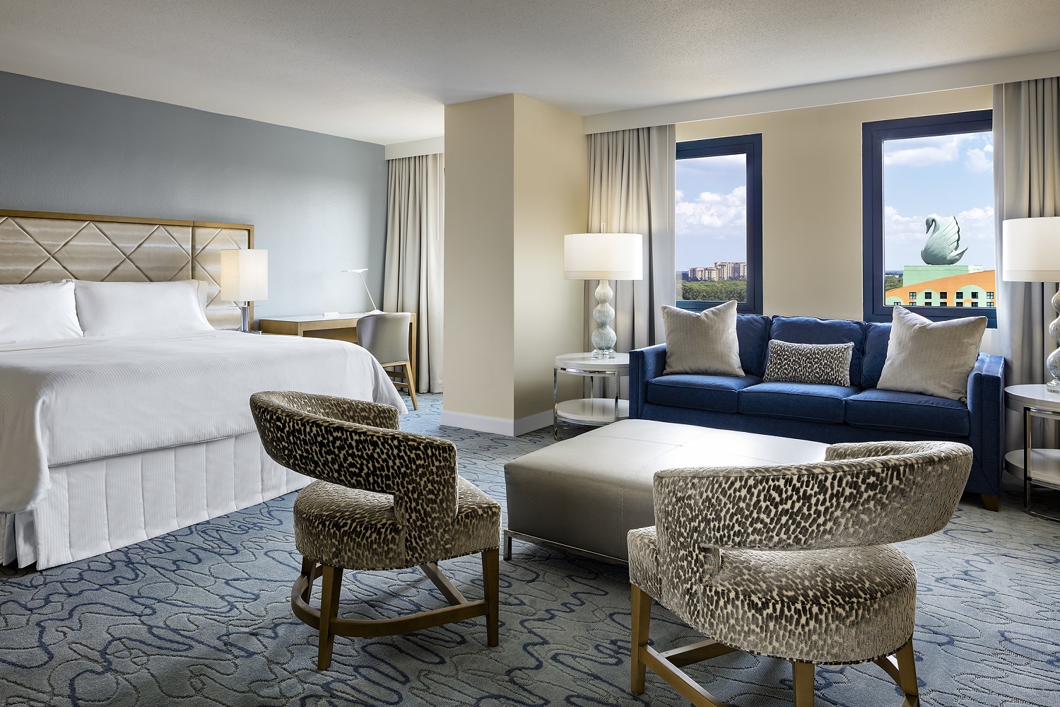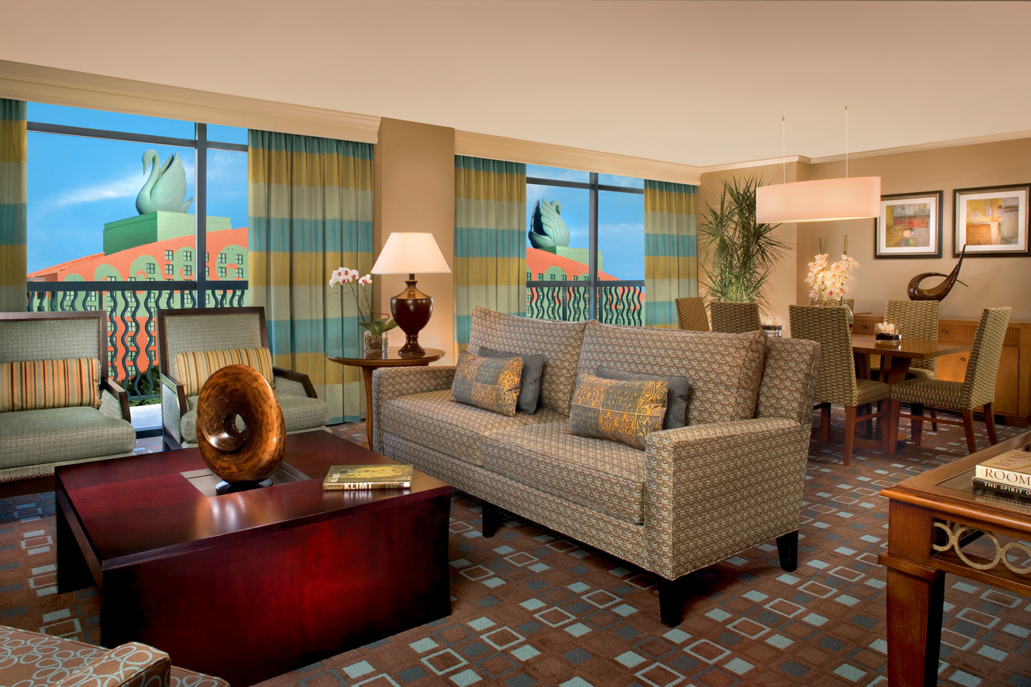 Просторный номер с одной спальней, гостиная с мягкой мебелью и обеденным столом на 6 персон. Ванная комната, гостевой туалет. Расположен в корпусе Swan. Дизайн выполнен по проекту всемирно-известного архитектора и дизайнера Майкла Грейвса, сочетает изысканность и непринужденный комфорт.